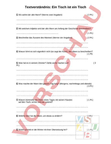 Textverständnis: Ein Tisch ist ein Tisch 1. Wo wohnt der alte Mann? (Nenne zwei Angaben) 2 Pt.) 2. Mit welchem Adjektiv wird der alte Mann am Anfang der Geschichte beschrieben? 1 Pt.) 3. Beschreibe das Äussere des Mannes! (Nenne vier Angaben) 2 Pt.) 4. Warum lohnt es sich eigentlich nicht (so sagt der Autor), den Mann zu beschreiben? 1 Pt) 5. Was hat es in seinem Zimmer? Zähle sechs Sachen auf! Pt.) (3 6. Was machte der Mann den ganzen Tag lang? (Morgens, nachmittags und abends) 3 Pt.) 7. Warum trommelte der Mann eines Tages mit seinen Fäusten auf den Tisch, schrie und war wütend? 1 Pt.) 8. Welche Idee hat der Mann, um etwas zu ändern? 1Pt.) 9. Wohin schrieb er die Wörter mit ihrer Übersetzung hin? 1 Pt.) 10. Warum musste der Mann laut lachen, wenn er die andern reden hörte? (1 Pt.) 11. Im Text steht: Der alte Mann im grauen Mantel konnte die Leute nicht mehr verstehen, das war nicht so schlimm. Was aber war viel schlimmer? 1 Pt.) 12. Die Geschichte endet ganz traurig! Warum? Wie endet sie denn? 1 Pt.) 13. Wie heisst der Autor dieser Geschichte? (1 Pt.) 14. Richtig oder falsch? 4 Pt.) Der alte Mann war froh, dass sich im Zimmer nichts geändert hatte. An dem Tag, als er etwas ändern wollte, regnete es draussen. Er wollte wissen, wie die Möbelstücke auf Französisch heissen. Das Fotoalbum hat er von seinem Grossvater bekommen. Weil seine Nachbarn laut riefen, klopfte er an die Wand und rief „Ruhe. Von diesem Abend an experimentierte er mit Wörtern, die er kannte. Der Mann war einmal verheiratet und hatte Kinder. Man sah den Mann auch später noch oft auf der Strasse. 15. Kannst DU den alten Mann verstehen? Was meint er eigentlich? Lies den unteren Text und schreibe die richtigen Wörter in die Lücken! 5 Pt.) Am Morgen blieb der alte Mann lange im Bild (er meinte eigentlich: ) liegen, um neun läutete das Fotoalbum (_), der Mann stand auf und stellte sich auf den Schrank (_), damit er nicht an den Füsse fror, dann nahm er seine Kleider aus der Zeitung (_), zog sich an, schaute in den Stuhl () an der Wand, setzte sich dann auf den Wecker () an den Teppich () und blätterte den Spiegel () durch, bis er den Tisch () seiner Mutter fand. Ein Bett (_) las er später oft auch noch. Total Punkte: Deine Punkte: Deine Note: Unterschrift der Eltern: