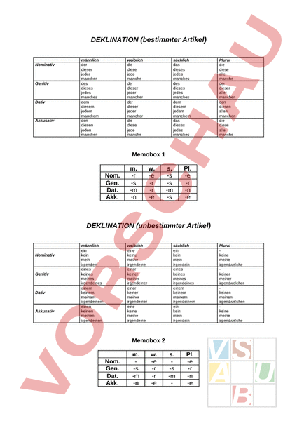 DEKLINATION (bestimmter Artikel) Nominativ Genitiv Dativ Akkusativ männlich der dieser jeder mancher des dieses jedes manches dem diesem jedem manchem den diesen jeden manchen weiblich die diese jede manche der dieser jeder mancher der dieser jeder mancher die diese jede manche sächlich das dieses jedes manches des dieses jedes manches dem diesem jedem manchem das dieses jedes manches Plural die diese alle manche der dieser aller mancher den diesen allen manchen die diese alle manche Memobox 1 Nom. Gen. Dat. Akk. m. -r -s -m -n w. -e -r -r -e s. -s -s -m -s Pl. -e -r -n -e DEKLINATION (unbestimmter Artikel) Nominativ Genitiv Dativ Akkusativ männlich ein kein mein irgendein eines keines meines irgendeines einem keinem meinem irgendeinem einen keinen meinen irgendeinen weiblich eine keine meine irgendeine einer keiner meiner irgendeiner einer keiner meiner irgendeiner eine keine meine irgendeine sächlich ein kein mein irgendein eines keines meines irgendeines einem keinem meinem irgendeinem ein kein mein irgendein Memobox 2 Nom. Gen. Dat. Akk. m. -s -m -n w. -e -r -r -e s. -s -m Pl. -e -r -n -e Plural keine meine irgendwelche keiner meiner irgendwelcher keinen meinen irgendwelchen keine meine irgendwelche DER DATIV UND DER AKKUSATIV Übung 1: Herr Müller erklärt d_ Kindern d_ Fahrplan. Frau Braun gibt d_ Gast d_ Hand. Wir kaufen d_ Kind ein_ Buch. Er bietet d_ Freund ein_ Zigarette an. Der Briefträger bringt d_ Frau d_ Telegramm. Walter diktiert d_ Freund ein_ Brief. Richard gibt d_ Briefträger d_ Geld. Bietet ihr d_ Freund kein_ Schokolade an? Ich gebe d_ Kindern mein_ Bücher. Wichtige Regeln: 1. 2. Übung 2: Bilde mit den folgenden Wörtern Sätze! Auto, Gast, gehören: Tür, Gast, öffnen, Herr Müller: zeigen, du, Stadt, Gast: zeigen, wir, Rechnung, Freunde: kaufen, sie, ein Schwamm, Kind: bringen, Frau Braun, Geld, Briefträger: PRÄPOSITIONEN (Kasus) Präpositionen mit dem Akkusativ bis durch entlang für gegen ohne um wider Präpositionen mit dem Dativ ab aus außer gemäß mit bei dank entgegen entsprechend nach nebst samt seit von zu gegenüber zufolge Präpositionen mit dem Dativ oder Akkusativ an auf hinter in neben über unter vor zwischen Wichtige Regeln: 1. 2. PRÄPOSITIONEN MIT DEM DATIV ODER DEM AKKUSATIV an 1. zur Ortsangabe: • mit Akkusativ auf die Frage „wohin? • mit Dativ auf die Frage „wo? 2. mit Dativ zur Zeitangabe bei Tageszeiten, Datumsangaben, Wochentagen. Am Freitagnachmittag ist um 4 Uhr Dienstschluss. 3. mit Akkusativ zur Zahlenangabe Es waren an die fünfzig Gäste anwesend. 4. an . vorbei mit Dativ Er ging an mir vorbei auf 1. zur Ortsangabe wo? oder wohin? 2. auf . zu mit Akk. zur Angabe einer Bewegung in eine Richtung Der Enkel lief auf die Großmutter zu. 3. auf . hin mit Akk. zur Angabe einer vorangegangenen Aussage Auf diesen Bericht hin müssen wir unsere Meinung ändern. 4. auf . hinaus mit Akk. zur Angabe eines Zeitraums Er hat sich auf viele Jahre hinaus verschultet. hinter 1. zur Ortsangabe wo? oder wohin? 2. hinter . zurück mit Dativ Sie blieb hinter der Gruppe zurück. in 1. zur Ortsangabe wo? oder wohin? 2. mit Dativ zur Zeitangabe Im April beginnen die Vögel zu brüten. 3. mit Dativ zum Hinweis auf eine schriftliche Vorlage oder eine mündliche Aussage In dem Drame „Hamlet steht folgendes Zitat:. 4. mit Dativ zur Angabe von inneren oder äußeren Zuständen (oft mit Possessivpronomen) In seiner Verzweiflung machte er eine Dummheit. neben 1. zur Ortsangabe wo? oder wohin? 2. mit Dativ ( zusätzlich, zu etwas anderem) Neben seinen physikalischen Forschungen schrieb er Gedichte. über 1. zur Ortsangabe wo? oder wohin? 2. mit Akkusativ (überqueren) Die Kinder liefen über die Straße. 3. mit Akkusativ und Zeitangabe (meist nachgestellt; während eines Zeitraums) Den ganzen Tag über hat er wenig geschafft. 4. mit Akkusativ zur Bezeichnung einer Steigerung (länger als, mehr als) Die Bauarbeiten haben über einen Monat gedauert. 5. mit Akkusativ zur Angabe eines Themas Sein Vortrag über die Eiszeit war hochinteressant. unter 1. zur Ortsangabe wo? oder wohin? 2. mit Dativ zur Zeit- und Zahlenangabe Sein Lohn liegt unter dem Mindestsatz. 3. mit Dativ zur Bezeichnung bestimmter Personen oder Sachen, die sich zwischen anderen befinden Zum Glück war unter den Reisenden ein Arzt. 4. mit Dativ zur Angabe einer Bedingung, wie etwas ist oder geschieht Natürlich konntet ihr unter diesen Umständen nicht kommen. vor 1. zur Ortsangabe wo? oder wohin? 2. mit Dativ zur Zeitangabe Leider hat er kurz vor der Prüfung sein Studium abgebrochen. 3. mit Dativ zur Angabe der Ursache eines Verhaltens Er konnte sich vor Freude kaum fassen. zwischen 1. zur Ortsangabe wo? oder wohin? 2. mit Dativ zur Zeit- oder Zahlenangabe Zwischen dem 2. und 4. Mai will ich die Fahrprüfung machen. 3. mit Dativ zur Angabe einer Beziehung Der Botschafter vermittelt zwischen den Regierungen. Übungen: Sie schrieb das Wort an Tafel. Die Sonne steht schon hoch an Himmel. Sie ist an 4. Juli geboren. An Anfang erschuf Gott Himmel und Erde. Die Villa hat an 20 Zimmer. Plötzlich lief das Kind auf Straße. Auf Erde leben etwa sechs Millionen Menschen. Ich ging auf Mutter zu. Auf Aussage hin muss ich meine Meinung ändern. Stell das Fahrrad hinter Haus. Das Motorrad steht hinter Garage. Sie bleibt jedes Mal hinter Anforderungen zurück. Er hat sich in Finger geschnitten. Die Villa steht in alten Park. In Jahr 1914 brach der Erste Weltkrieg aus. In halben Jahr sehen wir uns wieder. In Rede sagte der Kanzler: . In Angst sprangen einige Seeleute ins Wasser. Der Kellner legt das Besteck neben Teller. Der Stall liegt rechts neben Bauernhaus. Sie betreut neben Haushalt auch noch eine Kindergruppe. Der Entenschwarm fliegt über Fluss. Der Wasserkessel hing über Feuer. Der Sportler schwamm über Kanal nach England. Winter über verreisen wir nicht. Das geht über Kräfte. Über Französische Revolution gibt es verschiedene Meinungen. Sie legte ihm Kissen unter Kopf. Die Katze sitz