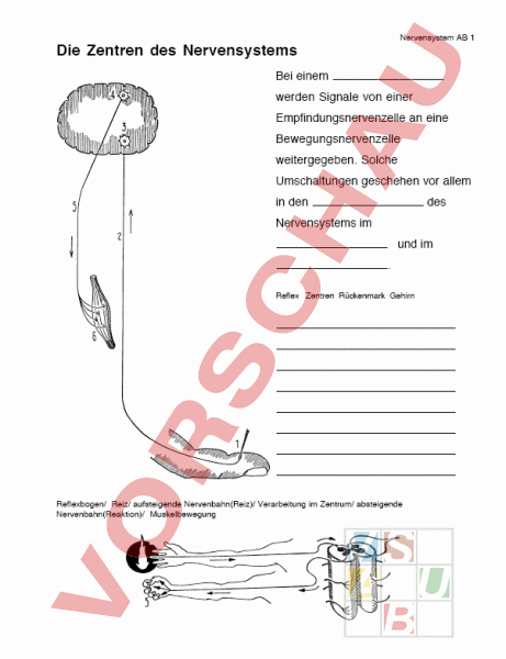 Nervensystem AB 1 Die Zentren des Nervensystems Bei einem werden Signale von einer Empfindungsnervenzelle an eine Bewegungsnervenzelle weitergegeben. Solche Umschaltungen geschehen vor allem in den des Nervensystems im und im Reflex Zentren Rückenmark Gehirn Reflexbogen/ Reiz/ aufsteigende Nervenbahn(Reiz)/ Verarbeitung im Zentrum/ absteigende Nervenbahn(Reaktion)/ Muskelbewegung Nervensystem AB 2 Die Teile des Nervensystems a) Die Sinnesorgane Alles, was wir von unserer Umwelt wissen, verdanken wir den Sinnesorganen. Sie lassen uns von früher Kindheit an alles erleben, was um uns vorgeht. Alle Erfahrungen und Erlebnisse, die wir im Verlaufe eines Tages, des ganzen Lebens sammeln, vermitteln uns die Sinnesorgane Auge, Ohr, Nase, Zunge und Haut. Es gibt Sinnesorgane, in denen mehr als ein Sinn untergebracht ist. Haut: Sinneszellen für Tasten, für Wärme, für Kälte, für Schmerz Zunge: Geschmackszellen Nase: Riechzellen Augen: Sehzellen Ohren: Hörzellen, Sinneszellen für das Gleichgewicht und für den Richtungssinn b) Die Nervenfasern Sie verlaufen wie der elektrische Draht in einer schützenden, isolierenden Schicht. Eine einzelne Nervenfaser stellt ein so zartes Fädchen dar, dass sie leicht zerreissen könnte. Wir finden daher immer viele Fasern zu einem ganzen Bündel vereinigt, ähnlich wie die Leitungen in einem Kabel. Ein Nervenfaserbündel bildet einen Nerv. Nervensystem AB 3 c) Das Gehirn Das Gehirn füllt die Schädelkapsel vollständig aus. Es liegt geschützt in einer zweifachen Hirnhaut und ist in die Hirnflüssigkeit gebettet. Eine so empfindliche Nervenmasse vermöchte eine direkte Berührung mit den harten Plattenknochen oder starke Stösse sonst nicht zu ertragen. Die harte Hirnhaut ist fest mit dem Schädelknochen verbunden, die weiche Hirnhaut dagegen schmiegt sich dem Gehirn an und sorgt für seine Ernährung. Grosshirn Kleinhirn/ verlängertes Mark/ Rückenmark/ Balken (Verbindung der Hemisphären) Das Grosshirn überlagert die übrigen Gehirnteile und besteht aus einer linken und einer rechten Hälfte, die durch eine tiefe Furche getrennt sind. Die Grosshirnrinde enthält schätzungsweise 10 Milliarden fein verästelte Nervenzellen (Schaltzentren). Durch unregelmässig verlaufende Furchen und Windungen wird die Rinde stark vergrössert. Sie ist Sitz von Bewusstsein, Wille, Verstand und Seelenleben. Nervensystem AB 4 Die Grosshirnrinde wird in verschiedene Felder mit besonderen Funktionen eingeteiIt: 1. Die Wahrnehmungsfelder sind Endstationen von Nervenbahnen aus den Sinnesorganen. In der Grosshirnrinde werden uns die Sinneseindrücke bewusst. 2. In den Erinnerungsfeldern werden diese Sinneseindrücke verarbeitet und gespeichert. 3. Aus den Bewegungsfeldern gehen Signale für willkürliche Bewegungen an die Muskeln. Die Felder der Grosshirnrinde enthalten Zentren für verschiedene Empfindungen und Tätigkeiten. Bei Hirnschlag oder Verletzung des Gehirns können einzelne Felder beeinträchtigt werden. Dadurch fallen bestimmte Tätigkeiten des Körpers aus (Bewegungen Sprechfähigkeit). Dieses Nervensystem mit Gehirn, Rückenmark und ausstrahlenden Nerven versorgt Skelettmuskulatur und Sinnesorgane. Es übermittelt die Signale für willkürliche („absichtliche) Bewegungen, Sinnesempfindungen und Reflexe. Für die inneren Organe, deren Tätigkeit wir nicht mit unserem Willen steuern können, hat der Körper ein anderes Nervensystem. Nervensystem AB 5 d) Das Rückenmark Die meisten Empfindungs- und Bewequngsnerven des Körpers münden in die Wirbelsäule. Im ganzen sind es 31 Nervenpaare, die sich hier zu einem fingerdicken Nervenstrang, dem Rückenmark, vereinigen. Es stellt somit unser grösstes Nervenleitungskabel dar, in dem Hunderttausende von Leitungen zusammengefasst sind. Viele Nervenbahnen enden in den Nervenzellen des Rückenmarks. Dieses ist somit nicht nur ein Leitungs-, sondern auch ein Befehlsorgan: Es nimmt Reize entgegen und erteilt Befehle. Werden durch einen Unfall die Wirbel des Rückens stark verschoben oder gebrochen, so spricht man von einem Wirbelsäulenbruch. Wird dabei das Rückenmark beschädigt, so tritt eine (Querschnitt-) Lähmung ein. Verschobene Bandscheiben zwischen den Rückenwirbeln können das Rückenmark ungünstig beeinflussen und Rückenschmerzen verursachen. Ein Bruch der Halswirbel wird als Genickbruch bezeichnet und verläuft meist tödlich. e) Das vegetative Nervensystem Wir können es die zweite Hilfszentrale des Gehirns nennen. Beidseitig der Wirbelsäule finden sich Ketten von erbsengroßen Nervenknoten. Ihre Nervenfasern gehen als Leitungen direkt zu den Eingeweiden umspinnen diese als feinstes Geflecht. Nervensystem AB 6 Zur Wiederholung Beim Nervensystem unterscheiden wir folgende fünf Teile: Willkürliche Bewegungen werden vom aus gesteuert. Alle lebenswichtigen Vorgänge in unserem Körper werden vom Nervensystem gesteuert. Die Zentren unseres Nervensystems sind und Den Ablauf „Reiz Verarbeitung Reaktion nennen wir Unsere Sinnesorgane sind , Das Gehirn besteht aus den Teilen . Unser Bewusstsein ist in der Die linke Hemisphäre ist die angesiedelt. Nervensystem AB 7 Schema Rückenmark