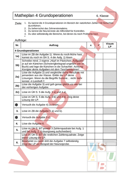 Arbeitsblatt: Matheplan am Beispiel der 4 Grundoperationen