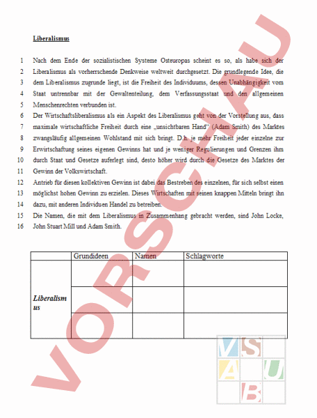 Liberalismus 1 Nach dem Ende der sozialistischen Systeme Osteuropas scheint es so, als habe sich der 2 Liberalismus als vorherrschende Denkweise weltweit durchgesetzt. Die grundlegende Idee, die 3 dem Liberalismus zugrunde liegt, ist die Freiheit des Individuums, dessen Unabhängigkeit vom 4 Staat untrennbar mit der Gewaltenteilung, dem Verfassungsstaat und den allgemeinen 5 Menschenrechten verbunden ist. 6 Der Wirtschaftsliberalismus als ein Aspekt des Liberalismus geht von der Vorstellung aus, dass 7 maximale wirtschaftliche Freiheit durch eine „unsichtbaren Hand (Adam Smith) des Marktes 8 zwangsläufig allgemeinen Wohlstand mit sich bringt. D.h. je mehr Freiheit jeder einzelne zur 9 Erwirtschaftung seines eigenen Gewinns hat und je weniger Regulierungen und Grenzen ihm 10 durch Staat und Gesetze auferlegt sind, desto höher wird durch die Gesetze des Marktes der 11 Gewinn der Volkswirtschaft. 12 Antrieb für diesen kollektiven Gewinn ist dabei das Bestreben des einzelnen, für sich selbst einen 13 möglichst hohen Gewinn zu erzielen. Dieses Wirtschaften mit seinen knappen Mitteln bringt ihn 14 dazu, mit anderen Individuen Handel zu betreiben. 15 Die Namen, die mit dem Liberalismus in Zusammenhang gebracht werden, sind John Locke, 16 John Stuart Mill und Adam Smith. Grundideen Liberalism us Namen Schlagworte