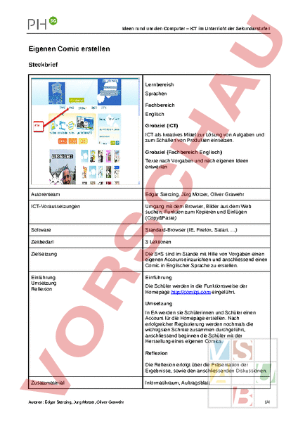 Ideen rund um den Computer – ICT im Unterricht der Sekundarstufe Eigenen Comic erstellen Steckbrief Lernbereich Sprachen Fachbereich Englisch Grobziel (ICT) ICT als kreatives Mittel zur Lösung von Aufgaben und zum Schaffen von Produkten einsetzen. Grobziel (Fachbereich Englisch) Texte nach Vorgaben und nach eigenen Ideen entwerfen Autorenteam Edgar Sterzing, Jürg Motzer, Oliver Grawehr ICT-Voraussetzungen Umgang mit dem Browser, Bilder aus dem Web suchen, Funktion zum Kopieren und Einfügen (Copy&Paste) Software Standard-Browser (IE, Firefox, Safari, ) Zeitbedarf 3 Lektionen Zielsetzung Die SS sind im Stande mit Hilfe von Vorgaben einen eigenen Account einzurichten und anschliessend einen Comic in Englischer Sprache zu erstellen. Einführung Umsetzung Reflexion Einführung Die Schüler werden in die Funktionsweise der Homepage eingeführt. Umsetzung In EA werden sie Schülerinnen und Schüler einen Account für die Homepage erstellen. Nach erfolgreicher Registrierung werden nochmals die wichtigsten Schritte zusammen durchgeführt, anschliessend beginnen die Schüler mit der Herstellung eines eigenen Comics. Reflexion Die Reflexion erfolgt über die Präsentation der Ergebnisse, sowie den anschliessenden Diskussionen. Zusatzmaterial Autoren: Edgar Sterzing, Jürg Motzer, Oliver Grawehr Informatikraum, Auftragsblatt 1/4 Ideen rund um den Computer – ICT im Unterricht der Sekundarstufe Eigenen Comic erstellen Beschreibung der Lektionsreihe Lektion Sozialform Durchführung, Ablauf der Lektionen Arbeitsform Medien Material 1 Verschiedene interessante und witzige Comic-Sequenzen im Beispielcomics Schulzimmer verteilen, welche die Schülerinnen und Schüler zu zweit im Rundgang betrachten können. 1 Die Lehrkraft informiert die über das anstehende Projekt, gibt den genauen und schriftlichen Auftrag bekannt. Beamer Die Lehrkraft erstellt ein Übungsbeispiel, in welchem die wichtigsten Arbeitsschritte vorgestellt werden und führt eine simulative Anmeldung durch. 1 EA Die melden sich auf an und erhalten ihr persönliches Passwort. 1 Die erhalten nochmals die wichtigsten Arbeitsschritte präsentiert, z.B. Einfügen eines Bildes, Herstellen der Sprechblasen und Einfügen des Textes, welche sie gleich umzusetzen versuchen. Beamer 1 erstellen ein MindMap um die Idee ihres Comics schriftlich zu fixieren. Papier HA EA MindMap fertigstellen. 2 GA stellen in 3-er Gruppen kurz ihr MindMap vor 2 EA beginnen mit der Arbeit an ihrem Comic, es kann auch eine weitere Lektion zur Erarbeitung eingesetzt werden. HA EA stellen ihren Comic zu Hause fertig. 3 stellen ihre Comics in kurzen Präsentationen vor. 3 wählen die drei interessantesten Comics und diskutieren im Plenum. Arbeit mit der ganzen Klasse, GA Gruppenarbeit mit Anzahl Personen, PA Partnerarbeit, EA Einzelarbeit Autoren: Edgar Sterzing, Jürg Motzer, Oliver Grawehr 2/4 Ideen rund um den Computer – ICT im Unterricht der Sekundarstufe Eigenen Comic erstellen OS Auftrag Erstelle mit Hilfe von comiqs.com einen eigenen Comic Methode Aus einer Fotosammlung und Bildern aus dem Internet wird durch einfügen von Sprechblasen und kurzen Texten ein kurzer Comic erstellt. Anleitung 1. Öffne die Seite und drücke auf sign up 2. Gib deinen Benutzernamen(User Name),dein Vorname (First Name), Name(Last Name),deine E-Mailadresse, dein Geschlecht (MaleMann;FemaleFrau), dein Passwort (zwei Mal),dein Land (Switzerland) und den Geheimcode(Secret Comiqs Code) im Feld ein und drücke auf Register Dann drücke auf log in und gib deine E-Mailadresse und dein Passwort ein. 3. drücke in der blauen Anzeigeleiste auf create 4. Fotos/Bilder: Jetzt kannst du nach Bildern und Fotos suchen. Dazu drückst du auf photos Dann kannst du einen Suchbegriff eingeben. Wenn du kein geeignetes Bild findest gehst du auf www.google.ch und suchst dort ein Bild. Danach klicke auf Web Photos und gib die Internetseite des Bildes ein Drücke auf add und das Bild erscheint Die gefundenen Bilder ziehst du mit der linken Maustaste auf das leere weisse Papier. Autoren: Edgar Sterzing, Jürg Motzer, Oliver Grawehr 3/4 Ideen rund um den Computer – ICT im Unterricht der Sekundarstufe 5. Sprechblasen und Layout: Drücke auf graphics Jetzt kannst du Sprechblasen auswählen und sie wie die Bilder auf die weisse Seite ziehen. Mit der Maus kannst die die Blase an die richtige Stelle bringen und vergrössern oder verkleinern. Mit einem Doppelklick in die Blase kannst du beginnen zu schreiben. Unterhalb der Sprechblasen findest du Layouts. Wie die Sprechblasen kannst du auch die verschiedenen Layouts in den Comic ziehen. (Achtung: Ein neues Layout ist automatisch eine neue Seite) 6. Text Wenn du nur Text einfügen willst ohne Sprechblasen, drücke auf text Dann wähle das Textform und ziehe sie auf die rechte Seite. Schreibe deinen Text und verändere ganz rechts die Schrift und Farbe. 7. Neue Seiten: Um dem Comic neue leere Seiten hinzuzufügen, drücke auf add 8. Speichern: Um deinen fertigen Comic zu speichern drücke auf save draft Jetzt erscheint folgendes Fenster. Gib deinem Comic einen Titel Wähle „No one but myself aus Beschreibe deinen Comic in einem Satz Dann drücke auf Save Autoren: Edgar Sterzing, Jürg Motzer, Oliver Grawehr 4/4
