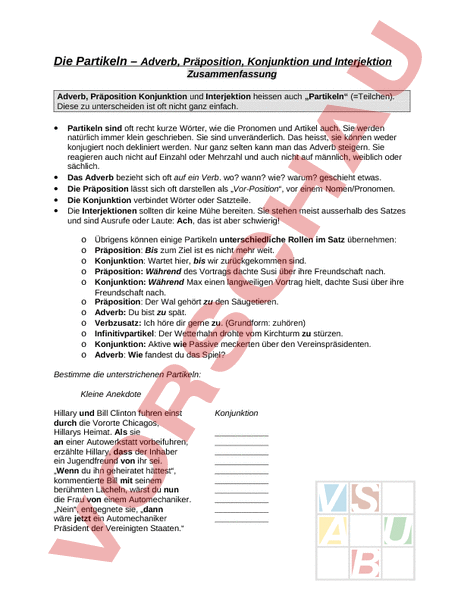 Die Partikeln – Adverb, Präposition, Konjunktion und Interjektion Zusammenfassung Adverb, Präposition Konjunktion und Interjektion heissen auch „Partikeln (Teilchen). Diese zu unterscheiden ist oft nicht ganz einfach. • • • • • Partikeln sind oft recht kurze Wörter, wie die Pronomen und Artikel auch. Sie werden natürlich immer klein geschrieben. Sie sind unveränderlich. Das heisst, sie können weder konjugiert noch dekliniert werden. Nur ganz selten kann man das Adverb steigern. Sie reagieren auch nicht auf Einzahl oder Mehrzahl und auch nicht auf männlich, weiblich oder sächlich. Das Adverb bezieht sich oft auf ein Verb. wo? wann? wie? warum? geschieht etwas. Die Präposition lässt sich oft darstellen als „Vor-Position, vor einem Nomen/Pronomen. Die Konjunktion verbindet Wörter oder Satzteile. Die Interjektionen sollten dir keine Mühe bereiten. Sie stehen meist ausserhalb des Satzes und sind Ausrufe oder Laute: Ach, das ist aber schwierig! o o o o o Übrigens können einige Partikeln unterschiedliche Rollen im Satz übernehmen: Präposition: Bis zum Ziel ist es nicht mehr weit. Konjunktion: Wartet hier, bis wir zurückgekommen sind. Präposition: Während des Vortrags dachte Susi über ihre Freundschaft nach. Konjunktion: Während Max einen langweiligen Vortrag hielt, dachte Susi über ihre Freundschaft nach. Präposition: Der Wal gehört zu den Säugetieren. Adverb: Du bist zu spät. Verbzusatz: Ich höre dir gerne zu. (Grundform: zuhören) Infinitivpartikel: Der Wetterhahn drohte vom Kirchturm zu stürzen. Konjunktion: Aktive wie Passive meckerten über den Vereinspräsidenten. Adverb: Wie fandest du das Spiel? Bestimme die unterstrichenen Partikeln: Kleine Anekdote Hillary und Bill Clinton fuhren einst durch die Vororte Chicagos, Hillarys Heimat. Als sie an einer Autowerkstatt vorbeifuhren, erzählte Hillary, dass der Inhaber ein Jugendfreund von ihr sei. „Wenn du ihn geheiratet hättest, kommentierte Bill mit seinem berühmten Lächeln, wärst du nun die Frau von einem Automechaniker. „Nein, entgegnete sie, „dann wäre jetzt ein Automechaniker Präsident der Vereinigten Staaten. Konjunktion Bestimme die unterstrichenen Partikeln: Kleine Anekdote Hillary und Bill Clinton fuhren einst durch die Vororte Chicagos, Hillarys Heimat. Als sie an einer Autowerkstatt vorbeifuhren, erzählte Hillary, dass der Inhaber ein Jugendfreund von ihr sei. „Wenn du ihn geheiratet hättest, kommentierte Bill mit seinem berühmten Lächeln, wärst du nun die Frau von einem Automechaniker. „Nein, entgegnete sie, „dann wäre jetzt ein Automechaniker Präsident der Vereinigten Staaten. Konjunktion Präposition Konjunktion Präposition Konjunktion Präposition Konjunktion Präposition Adverb (der Zeit) Präposition Adverb (des Grundes) Adverb der Zeit