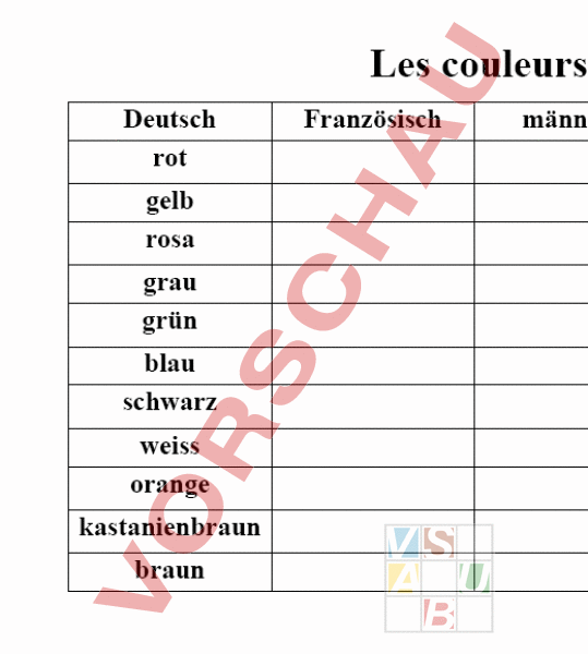 Les couleurs Deutsch rot gelb rosa grau grün blau schwarz weiss orange kastanienbraun braun Französisch männlich weiblich