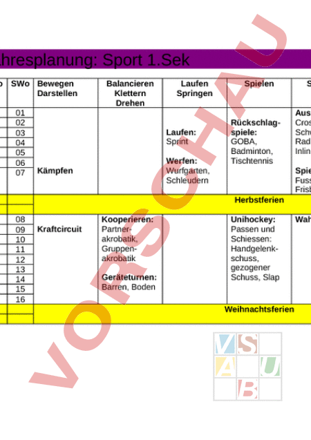 Jahresplanung: Sport 1.Sek KWo SWo Bewegen Darstellen 34 35 36 37 38 39 40 41 42 43 44 45 46 47 48 49 50 51 52 01 01 02 03 04 05 06 07 Balancieren Klettern Drehen Laufen Springen Laufen: Sprint Werfen: Wurfgarten, Schleudern Kämpfen Spielen Rückschlagspiele: GOBA, Badminton, Tischtennis Sport im Freien Spezielles Ausdauer: Crosslauf, Schwimmen, Rad fahren, Inline skaten, Noten 80m Sprint evt. Weitwurf Spiele: Fussball, Frisbee Herbstferien 08 09 10 11 12 13 14 15 16 Kraftcircuit Kooperieren: Partnerakrobatik, Gruppenakrobatik Geräteturnen: Barren, Boden Unihockey: Passen und Schiessen: Handgelenkschuss, gezogener Schuss, Slap Weihnachtsferien Wahlspiele evt. Partnerakrobatik Unihockey: Technik, Spiel evt. Unihockeyturnier Gerätebahn 02 03 04 05 06 07 08 09 10 11 12 13 14 15 16 17 18 19 20 21 22 23 24 25 26 17 18 19 20 21 22 23 24 25 26 27 28 29 Klettern: eigene Stationen Tanz: Streetdance, Hip Hop Eishockey Passen und Schiessen Wintersporttag Schwingen: Schaukelringe Drehen/ Fliegen: Salto vorwärts, Gerätebahn Eishockeyparcours und Spiel Ringübung Hochsprung: Fosberryflop Sportferien Basketball: Korbleger, Sternschritt, 3 Schritt. evt. Basketballturnier Basketball: Technik und Spiel Hochsprung Frühlingsferien 30 31 32 33 34 35 36 37 Vorbereitung Sporttag: Lauf, Sprung, Wurf Wahlspiel Ausdauer: Pendelstaffette Sporttag Fussball- und Volleyballturnier Sommerferien Sporttag: 12min Lauf Weitwurf, Weitsprung