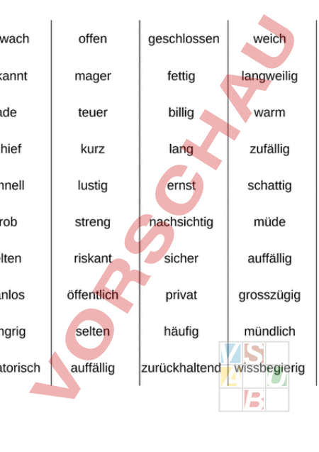 schwach offen geschlossen weich hart fremd bekannt mager fettig langweilig spannend scharf fade teuer billig warm kalt gerade schief kurz lang zufällig absichtlich langsam schnell lustig ernst schattig sonnig fein grob streng nachsichtig müde frisch üblich selten riskant sicher auffällig schlicht planmässig planlos öffentlich privat grosszügig geizig satt hungrig selten häufig mündlich schriftlich fakultativ obligatorisch auffällig zurückhaltend wissbegierig interesselos stark