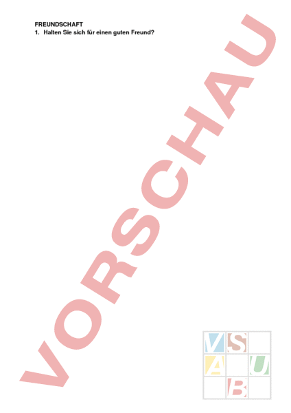 FREUNDSCHAFT 1. Halten Sie sich für einen guten Freund? 2. Was empfinden Sie als Verrat: a. wenn der andere es tut? b. wenn Sie es tun? 3. Halten Sie die Dauer einer Freundschaft (Unverbrüchlichkeit) für ein Wertmass einer Freundschaft? 4. Was würden Sie einem Freund nicht verzeihen: a. Doppelzüngigkeit? b. dass er Ihnen eine Frau ausspannt? c. dass er Ihrer sicher ist? d. Ironie auch Ihnen gegenüber? e. dass er keine Kritik verträgt? f. dass er Personen, mit denen Sie sich verfeindet haben, durchaus schätzt und gerne mit ihnen verkehrt? g. dass Sie keinen Einfluss auf ihn haben? 5. Was fürchten Sie mehr: das Urteil von einem Freund oder von einem Feind? Warum? 6. Wie reden Sie über verlorene Freunde? 7. Sind Sie sich selber ein Freund? HEIMAT 1. Wenn Sie sich in der Fremde aufhalten und Landsleute treffen: befällt Sie dann Heimweh oder dann gerade nicht? 2. Hat Heimat für Sie eine Flagge? 3. Was bezeichnen Sie als Heimat? a. ein Dorf? b. eine Stadt oder ein Quartier darin? c. einen Sprachraum? d. einen Erdteil? e. eine Wohnung? 4. Gesetzt den Fall, Sie wären in der Heimat verhasst: könnten Sie deswegen bestreiten, dass es Ihre Heimat ist? 5. Wie viel Heimat brauchen Sie? 6. Was macht Sie heimatlos? a. Arbeitslosigkeit? b. Vertreibung aus politischen Gründen? c. Karriere in der Fremde? d. dass Sie in zunehmendem Grad anders denken als die Menschen, die den gleichen Bezirk als Heimat bezeichnen wie Sie und ihn beherrschen? 7. Empfinden Sie die Erde überhaupt als heimatlich? 8. Auch Soldaten auf fremdem Territorium fallen bekanntlich für die Heimat: wer bestimmt, was Sie der Heimat schulden? 9. Können Sie sich überhaupt ohne Heimat denken? 10. Woraus schliessen Sie, dass Tiere wie Gazellen, Nilpferde, Bären, Pinguine, Tiger, Schimpansen usw., die hinter Gittern oder in Gehegen aufwachsen, den Zoo nicht als Heimat empfinden? EIGENTUM 1. Können Sie sich erinnern, seit welchem Lebensjahr es Ihnen selbstverständlich ist, dass Ihnen etwas gehört, beziehungsweise nicht gehört? 2. Was empfinden Sie als Eigentum: a. was Sie gekauft haben? b. was Sie erben? c. was Sie gemacht haben? 3. Auch wenn Sie den betreffenden Gegenstand (Kugelschreiber, Schirm, Armbanduhr usw.) ohne weiteres ersetzen können: empört Sie der Diebstahl als solcher? Warum? 4. Wissen Sie, was Sie brauchen? 5. Wenn Sie auf der Strasse stehen bleiben, um einem Bettler etwas auszuhändigen: warum machen Sies immer so flink und so unauffällig wie möglich? 6. Wie stellen Sie sich Armut vor? 7. Wer hat Sie den Unterschied gelehrt zwischen Eigentum, das sich verbraucht, und Eigentum, das sich vermehrt, oder hat Sie das niemand gelehrt? 8. Warum schenken Sie gerne? TOD 1. Haben Sie Angst vor dem Tod und seit welchem Lebensjahr? Was tun Sie dagegen? 2. Möchten Sie unsterblich sein? 3. Möchten Sie wissen, wie Sterben ist? 4. Wovor haben Sie mehr Angst: dass Sie auf dem Totenbett jemanden beschimpfen könnten, der es nicht verdient, oder dass Sie allen verzeihen, die es nicht verdienen? 5. Wenn Sie gerade keine Angst haben vor dem Sterben: weil Ihnen dieses Leben gerade lästig ist oder weil Sie gerade den Augenblick geniessen? 6. Was stört Sie an Begräbnissen? 7. Möchten Sie lieber mit Bewusstsein sterben oder überrascht werden von einem fallenden Ziegel, von einem Herzschlag, von einer Explosion usw.? 8. Wenn Sie an ein Reich der Toten (Hades) glauben: beruhigt Sie die Vorstellung, dass wir uns alle wiedersehen in Ewigkeit, oder haben Sie deshalb Angst vor dem Tod? HOFFNUNG 1. Wissen Sie in der Regel, was Sie hoffen? 2. Wie oft muss eine bestimmte Hoffnung (z.B. eine politische) sich nicht erfüllen, damit Sie die betroffene Hoffnung aufgeben, und gelingt Ihnen dies, ohne sich sofort eine andere Hoffnung zu machen? 3. Hoffen Sie angesichts der Weltlage: a. auf die Vernunft? b. auf ein Wunder? c. dass es weitergeht wie bisher? 4. Kann Hass eine Hoffnung erzeugen? 5. Hoffen Sie auf ein Jenseits? HUMOR 1. Halten Sies für Humor: a. wenn wir über Dritte lachen? b. wenn Sie über sich selbst lachen? c. wenn Sie jemanden dazu bringen, dass er, ohne sich zu schämen, über sich selber lachen kann? 2. Wenn Sie alles Lachen abziehen, das auf Kosten von Dritten geht: finden Sie, dass Sie oft Humor haben? 3. Können Sie einen Menschen, den sie aus politischen Gründen hassen, mit Humor sehen (nicht bloss mit Witz), ohne dabei den Hass zu verlieren? 4. Was ertragen Sie nur mit Humor? 5. Gesetzt den Fall, Sie glauben an Gott: kennen Sie ein Anzeichen dafür, dass er Humor hat? HUMOR TOD FREUNDSCHAF HEIMAT EIGENTUM HOFFNUNG