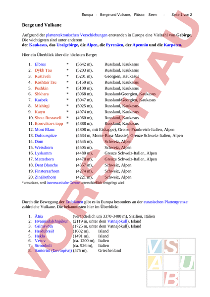 Arbeitsblatt: Europa: Berge-Vulkane-Seen-Flüsse