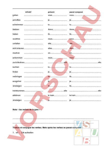 infinitif présent passé composé gehen vous vous. antreffen je. je schwimmen tu. tu bleiben Anne Anne haben ils ils. erzählen nous nous. umfallen elle elle. sich bräunen elles. elles. machen on on. ankommen nous nous. zurückkehren. elle .elle suchen tu. tu finden je. je verbringen ils ils. ausgehen je. je einsteigen ils ils. heimkommen. elle .elle abfahren le train. le train einsteigen je. je Note « les verbes de la gare » Traduis et conjugue les verbes. Mets après les verbes au passé composé 1. wir Zelt aufstellen . 2. sie (pl./w) hineingehen . 3. du Geld verdienen . 4. er mieten ein Mountainbike . 5. ich Spaghetti essen . 6. wir haben . 7. sie sg.) ankommen . 8. ihr sein 9. er lachen . 10. sie (pl./m) hinauf/einsteigen . 11. Sie (höfl.) weggehen in die Ferien . 12. du Volleyball spielen . 13. sie (pl./w) /umsteigen (Zug) . 14. ihr hinausgehen . 15. er am Strand bräunen . 16. ich schwimmen . 17. sie (sg.) nach Schaffhausen gehen . 18. wir heimkommen . 19. ich besuchen ein Museum . 20. sie (sg.) umfallen .