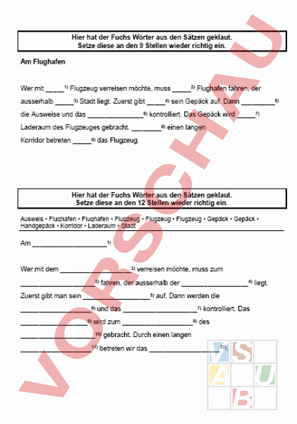 Am Flughafen Wer mit dem Flugzeug verreisen möchte, muss zum Flughafen fahren, der ausserhalb der Stadt liegt. Zuerst gibt man sein Gepäck auf. Dann werden die Ausweise und das Handgepäck kontrolliert. Das Gepäck wird zum Laderaum des Flugzeuges gebracht. Durch einen langen Korridor betreten wir das Flugzeug. Hier hat der Fuchs Wörter aus den Sätzen geklaut. Setze diese an den 9 Stellen wieder richtig ein. Am Flughafen Wer mit1) Flugzeug verreisen möchte, muss2) Flughafen fahren, der ausserhalb3) Stadt liegt. Zuerst gibt4) sein Gepäck auf. Dann5) die Ausweise und das6) kontrolliert. Das Gepäck wird7) Laderaum des Flugzeuges gebracht. 8) einen langen Korridor betreten9) das Flugzeug. Hier hat der Fuchs Wörter aus den Sätzen geklaut. Setze diese an den 12 Stellen wieder richtig ein. Ausweis • Flughafen • Flughafen • Flugzeug • Flugzeug • Flugzeug • Gepäck • Gepäck • Handgepäck • Korridor • Laderaum • Stadt Am 1) Wer mit dem2) verreisen möchte, muss zum 3) fahren, der ausserhalb der 4) liegt. Zuerst gibt man sein 5) auf. Dann werden die6) und das 7) kontrolliert. Das 8) wird zum9) des 10) gebracht. Durch einen langen11) betreten wir das12). Bei 11 Wörtern hat der Fuchs Teile der Wörter geklaut. Vervollständige die angeknabberten Wörter. Am Flughafen Wer mit dem Flug 1) verreisen möchte, mu 2) zum Flug 3) fahren, der ausse 4) der St 5) liegt. Zuerst gi 6) man sein Gep 7) auf. Dann werden die Ausw 8) und das Handg 9) kontrolliert. Das Gepäck wird zum Lade 10) des Flugzeuges gebracht. Durch einen langen Korr 11) betreten wir das Flugzeug. Der Fuchs hat die Sätze auseinandergerissen. Bring die passenden Satzhälften wieder zusammen. 1) Wer mit dem Flugzeug verreisen möchte, 2) Zuerst gibt man 3) Dann werden die Ausweise und 4) Das Gepäck wird zum Laderaum 5) Durch einen 6) Korridor betreten A) langen B) das Handgepäck kontrolliert. C) sein Gepäck auf. D) muss zum Flughafen fahren, der ausserhalb der Stadt liegt. E) wir das Flugzeug. F) des Flugzeuges gebracht. Richtige Kombination 1 - 2 - 3 - 4 - 5 - 6 - Der Fuchs hat die Wörter der Sätze zusammengeschoben. Trenn sie wieder an der richtigen Stelle! AMFLUGHAFENWERMITDEMFLUGZEUGVERREISENMÖC HTE,MUSSZUMFLUGHAFENFAHREN,DERAUSSERHALBD ERSTADTLIEGT.ZUERSTGIBTMANSEINGEPÄCKAUF.DAN NWERDENDIEAUSWEISEUNDDASHANDGEPÄCKKONTRO LLIERT.DASGEPÄCKWIRDZUMLADERAUMDESFLUGZEU GESGEBRACHT.DURCHEINENLANGENKORRIDORBETRE TENWIRDASFLUGZEUG. Der Fuchs hat die Sätze im Text aufgescheucht. Bring sie wieder in die richtige Reihenfolge! A) Wer mit dem Flugzeug verreisen möchte, muss zum Flughafen fahren, der ausserhalb der Stadt liegt. B) Dann werden die Ausweise und das Handgepäck kontrolliert. C) Am Flughafen D) Korridor betreten wir das Flugzeug. E) Durch einen langen F) Zuerst gibt man sein Gepäck auf. G) Das Gepäck wird zum Laderaum des Flugzeuges gebracht. Richtige Reihenfolge: Der Fuchs hat die Buchstaben der einzelnen Wörter aufgescheucht. Welche Wörter hat der Fuchs gejagt? Am (heFfglaun)1 Wer mit dem Flugzeug (eienevrsr)2 möchte,(smus)3 zum Flughafen (rnhefa)4, der (raslaeshub)5 der (aStdt)6 liegt. Zuerst(bgti)7 man sein (äecGpk)8 auf. Dann werden die(eseuisAw)9 und das (eäkadgcpHn)10 kontrolliert. Das Gepäck wird zum(raeumLda)11 des Flugzeuges(agrtcehb)12. Durch einen langen irKorodr)13 betreten wir das Flugzeug. Der Fuchs hat Buchstaben aus den Wörtern geklaut. Gib den Wörtern die richtigen Buchstaben wieder zurück! 7 mal (i oder ie oder ieh) Am Flughafen Wer mt1) dem Flugzeug verreisen möchte, muss zum Flughafen fahren, der ausserhalb der Stadt lgt2). Zuerst gbt3) man sein Gepäck auf. Dann werden die Ausweise und das Handgepäck kontrollrt4). Das Gepäck wrd5) zum Laderaum des Flugzeuges gebracht. Durch einen langen Korrdor6) betreten wr7) das Flugzeug. Der Fuchs hat die Wörter aufgescheucht. Bring sie wieder in die richtige Reihenfolge! Satz 1 zum • verreisen • Flughafen • Wer • ausserhalb • mit • der • fahren, • dem • der • Stadt • muss • Flugzeug • liegt. • möchte, Wer Satz 2 Gepäck • sein • man • gibt • auf. • Zuerst Zuerst Satz 3 und • die • Dann • Handgepäck • Ausweise • kontrolliert. • das • werden Dann Satz 4 gebracht. • Das • Laderaum • zum • Gepäck • wird • des • Flugzeuges Das Satz 5 wir • Korridor • betreten • Flugzeug. • das Korridor