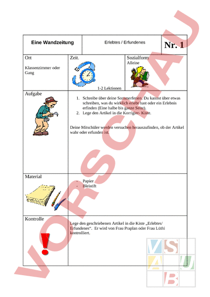 Eine Wandzeitung Ort Erlebtes Erfundenes Zeit. Nr. 1 Sozialform Alleine Klassenzimmer oder Gang 1-2 Lektionen Aufgabe 1. Schreibe über deine Sommerferien. Du kannst über etwas schreiben, was du wirklich erlebt hast oder ein Erlebnis erfinden (Eine halbe bis ganze Seite). 2. Lege den Artikel in die Korrigier- Kiste. Deine Mitschüler werden versuchen herauszufinden, ob der Artikel wahr oder erfunden ist. Material Kontrolle Papier Bleistift Lege den geschriebenen Artikel in die Kiste „Erlebtes/ Erfundenes. Er wird von Frau Praplan oder Frau Lüthi kontrolliert. Eine Wandzeitung Ort Recherchiertes/ Berichte Zeit. Nr. 2 Sozialform Alleine oder zu zweit Klassenzimmer oder Gang 2 Lektionen Aufgabe 1. Entscheide dich über welches der 2 Themen du schreiben möchtest: Mein Lieblingstier Stars (Sänger, Sportler, Schauspieler) 2. Suche zu Hause oder in der Kiste Informationen über das Thema, das du gewählt hat. 3. Schreiben einen Artikel (ca. 1 Seite) mit Hilfe deiner Informationen 4. Lege den Artikel in die Korrigier- Kiste. Material Papier Bleistift Bücher, Hefte (selbst mitgebrachtes, oder aus der Kiste) Kontrolle Lege den geschriebenen Artikel in die Kiste „Recherchiertes/Berichte. Er wird von Frau Praplan oder Frau Lüthi kontrolliert. Eine Wandzeitung Ort Witze/ Rätsel/ Horoskop Zeit Nr. 3 Sozialform Alleine oder zu zweit Klassenzimmer oder Gang 1 Lektion Aufgabe 1. Gestalte ein farbiges A3- Blatt mit: Witzen (erfundene oder gehörte) Rätsel (in der Kiste sind Beispiele) Erfundene Horoskope 2. Lege den Artikel in die Korrigier- Kiste. Du kannst dich auch nur für eines entscheiden. (zum Beispiel eine Witzseite) Material Farbiges A3- Papier Bleistift Evt. Farbstifte Kontrolle Lege den geschriebenen Artikel in die Kiste „Witze/Rätsel/ Horoskop. Er wird von Frau Praplan oder Frau Lüthi kontrolliert. Eine Wandzeitung Ort Mein Steckbrief Zeit Nr. 4 Sozialform Alleine oder zu zweit Klassenzimmer oder Gang 1 Lektion Aufgabe 1. Schreibe auf ein A4- Blatt einen Text über dich. (mindestens eine halbe Seite) 2. In dem Text kann vorkommen: Name, Alter, Geburtstag Familie, Haustier, Wohnort Freunde, Freizeitbeschäftigung Schule (Lieblingsfach) 3. Lege den Artikel in die Korrigier- Kiste. Du kannst zusätzlich etwas über dich zeichnen. Material Papier Bleistift Unterlage Evt. Farbstifte Kontrolle Lege den geschriebenen Artikel in die Kiste „Mein Steckbrief. Er wird von Frau Praplan oder Frau Lüthi kontrolliert. Eine Wandzeitung Ort Bildergeschichte zeichnen Zeit. Nr. 5 Sozialform Alleine oder zu zweit Klassenzimmer oder Gang 1-2 Lektionen Aufgabe 1. Zeichne eine Bildergeschichte mit einem Dinosaurier als Hauptfigur. (mind. 4 Bilder) 2. Wenn du willst, kannst darunter das Bild beschreiben 3. Lege den Artikel in die Korrigier- Kiste. Material Bleistift Bildergeschichten- Papier Farbstifte Kontrolle Lege den geschriebenen Artikel in die Kiste „Bildergeschichte zeichnen. Er wird von Frau Praplan oder Frau Lüthi kontrolliert.