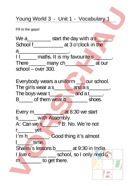 Young World 3 Unit 1 Vocabulary 1 Fill in the gaps! We a_ start the day with s. School f_ at 3 oclock in the a_. l maths. It is my favourite s_. There many ch_ at our school – over 300. Everybody wears uniform our school. The girls wear s_ and s. The boys wear t_ and t_. B_ of them wear b shoes. Every m_ at 8:30 we start s_ with Assembly. A: Can we s? B: No. Were not r yet. Im h. Good thing its almost ltime. Shalinis lessons b at 9:30 in India. live c school, so only need 5 m to get there.