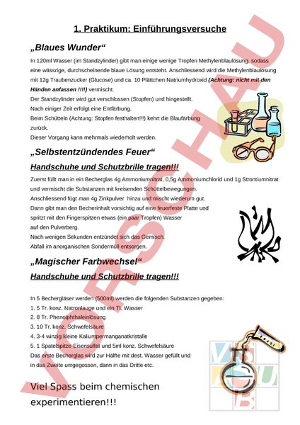 1. Praktikum: Einführungsversuche „Blaues Wunder In 120ml Wasser (im Standzylinder) gibt man einige wenige Tropfen Methylenblaulösung, sodass eine wässrige, durchscheinende blaue Lösung entsteht. Anschliessend wird die Methylenblaulösung mit 12g Traubenzucker (Glucose) und ca. 10 Plättchen Natriumhydroxid (Achtung: nicht mit den Händen anfassen !!!!) vermischt. Der Standzylinder wird gut verschlossen (Stopfen) und hingestellt. Nach einiger Zeit erfolgt eine Entfärbung. Beim Schütteln (Achtung: Stopfen festhalten!!!) kehrt die Blaufärbung zurück. Dieser Vorgang kann mehrmals wiederholt werden. „Selbstentzündendes Feuer Handschuhe und Schutzbrille tragen!!! Zuerst füllt man in ein Becherglas 4g Ammoniumnitrat, 0,5g Ammoniumchlorid und 1g Strontiumnitrat und vermischt die Substanzen mit kreisenden Schüttelbewegungen. Anschliessend fügt man 4g Zinkpulver hinzu und mischt wiederum gut. Dann gibt man den Becherinhalt vorsichtig auf eine feuerfeste Platte und spritzt mit den Fingerspitzen etwas (ein paar Tropfen) Wasser auf den Pulverberg. Nach wenigen Sekunden entzündet sich das Gemisch. Abfall im anorganischen Sondermüll entsorgen. „Magischer Farbwechsel Handschuhe und Schutzbrille tragen!!! In 5 Bechergläser werden (500ml) werden die folgenden Substanzen gegeben: 1. 5 Tr. konz. Natronlauge und ein TL Wasser 2. 8 Tr. Phenolphthaleinlösung 3. 10 Tr. konz. Schwefelsäure 4. 3-4 winzig kleine Kaliumpermanganatkristalle 5. 1 Spatelspitze Eisensulfat und 5ml konz. Schwefelsäure Das erste Becherglas wird zur Hälfte mit dest. Wasser gefüllt und in das Zweite umgegossen, dann in das Dritte etc. Viel Spass beim chemischen experimentieren!!!