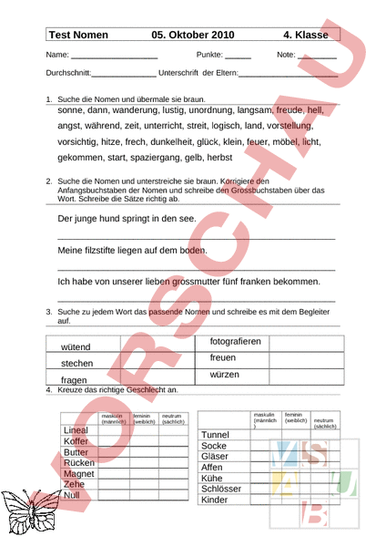 Test Nomen 05. Oktober 2010 Name: 4. Klasse Punkte: Note: Durchschnitt:_ Unterschrift der Eltern:_ 1. Suche die Nomen und übermale sie braun. sonne, dann, wanderung, lustig, unordnung, langsam, freude, hell, angst, während, zeit, unterricht, streit, logisch, land, vorstellung, vorsichtig, hitze, frech, dunkelheit, glück, klein, feuer, möbel, licht, gekommen, start, spaziergang, gelb, herbst 2. Suche die Nomen und unterstreiche sie braun. Korrigiere den Anfangsbuchstaben der Nomen und schreibe den Grossbuchstaben über das Wort. Schreibe die Sätze richtig ab. Der junge hund springt in den see. Meine filzstifte liegen auf dem boden. Ich habe von unserer lieben grossmutter fünf franken bekommen. 3. Suche zu jedem Wort das passende Nomen und schreibe es mit dem Begleiter auf. fotografieren wütend freuen stechen würzen fragen 4. Kreuze das richtige Geschlecht an. maskulin (männlich) Lineal Koffer Butter Rücken Magnet Zehe Null feminin (weiblich) maskulin (männlich neutrum (sächlich) Tunnel Socke Gläser Affen Kühe Schlösser Kinder feminin (weiblich) neutrum (sächlich) 5. Fülle die Tabelle aus. Singular Plural Singular das Bett die Schwerter Plural die Formen das Foto der Mann die Nuss die Lehrerin die Fackel die Zeugnisse der Würfel das Lied der Baum der Gummi der Punkt das Licht das Zimmer 6. Schreibe das zusammengesetzte Nomen mit Begleiter auf. Kochen Fahren Wandern Liegen Turnen Buch Rad Schuhe Stuhl Halle Buch Lampe Haus Untergang Spinne Feld Bild Tasche Schlüssel Sonne Netz Fussball 7. Suche den richtigen Oberbegriff. Apfel, Banane, Orange Tisch, Stuhl, Bett, Schrank Lehrer, Arzt, Maurer, Polizist Pferd, Kuh Vogel, Schlange Milch, Reis, Kartoffeln, Brot