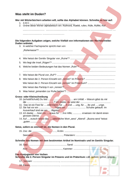 Arbeitsblatt: Übungsblatt zum Umgang mit Duden