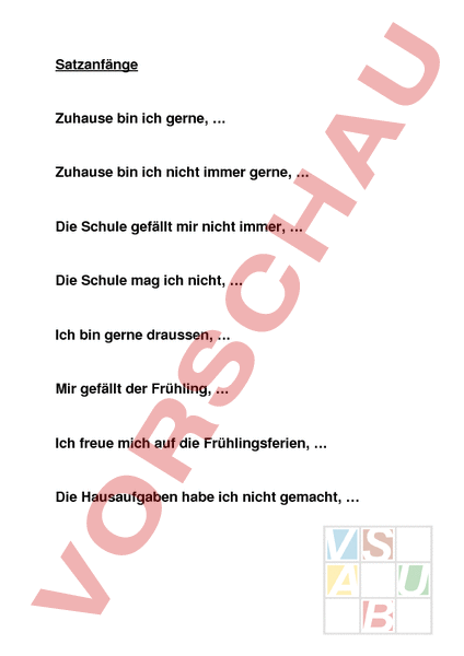 Satzanfänge Zuhause bin ich gerne, Zuhause bin ich nicht immer gerne, Die Schule gefällt mir nicht immer, Die Schule mag ich nicht, Ich bin gerne draussen, Mir gefällt der Frühling, Ich freue mich auf die Frühlingsferien, Die Hausaufgaben habe ich nicht gemacht, Die Merkmale von „weilSätzen a) Lies die folgenden Sätze! Markiere das Verbindungswort „weil und das konjugierte Verb im Satz. Lena geht im Kolbenacker zur Schule, weil sie in Seebach wohnt. Später möchte Lena Ärztin werden, weil sie gerne anderen Menschen hilft. Lena geht gerne in die Schule, weil sie neben einer lieben Freundin sitzt. a. Wo steht das konjugierte Verb im Satz mit „weil? Das konjugierte Verb steht an zweiter Stelle im Satz. Das konjugierte Verb steht am Anfang des Satzes. Das konjugierte Verb steht am Ende des Satzes. b. Was kommt im „weil Satz vor? Der„weil Satz sagt den Grund, warum man etwas macht. Im „weil Satz sagt man, was man machen muss. b. Steht der Grund vor oder nach „weil? Der Grund steht nach „weil. Der „weilSatz nennt den Grund. Der Grund steht vor dem Satz mit „weil. c. Was für ein Satz ist der Satz mit „weil? Der Satz mit „weil ist ein Fragesatz. Der Satz mit „weil ist ein Nebensatz. Der Satz mit „weil ist ein Hauptsatz. Ein „weilSatz sagt den Grund Warum fährst du nicht mit dem Rad? (Es regnet.) Weil es regnet._ 1. Warum gehst du gerne ins Kino? (Ich esse gerne Popcorn) 2. Warum gehst du in den Fussball. (Es macht mir Spass) 3. Warum fährst du nicht Auto? (Ich bin noch zu jung) 4. Warum magst du den Frühling? (Ich spiele gerne draussen) 5. Warum gehst du in die Schule? (Ich lerne dort viel) WEIL – DA Ergänze die Sätze! Er kommt heute nicht zum Unterricht, weil er krank ist. Ich kann dir nicht sagen, wo Rudi ist, ich ihn schon lange nicht mehr gesehen habe. es regnet, bleibe ich zuhause. Er soll Geld bekommen, er viel gearbeitet hat. Frank sucht sich eine neue Arbeit, es ihm nicht mehr gefällt. Max muss Automechaniker werden, seine Eltern eine Werkstatt haben. Warum? Verbinde die Sätze mit „weil Ich gehe jetzt nach Hause. Ich bin müde. Der Film hat mir nicht gefallen. Er war so langweilig. In dieses Restaurant gehe ich nicht mehr. Es ist so teuer und das Essen schmeckt mir nicht. Nein danke, ich trinke keinen Wein mehr. Ich muss noch Auto fahren. Ich gehe jetzt ins Bett. Ich muss morgen früh aufstehen. Wir essen kein Fleisch. Wir sind Vegetarier. Ich lerne Deutsch. Ich möchte eine bessere Arbeit finden. Er macht eine Diät. Er hat 5 Kilo zugenommen. Sie geht zum Augenarzt. Sie braucht eine neue Brille. Sie arbeitet halbtags. Sie hat vier Kinder. Wir brauchen dringend Urlaub. Wir haben im letzten Jahr sehr viel gearbeitet. Ich sehe gerne „Universum im Fernsehen. Ich interessiere mich für Tiere. Warum? Verbinde die Sätze mit „weil Ich schenke meiner Freundin Blumen. Sie hat heute Geburtstag. Er kauft eine neue Waschmaschine. Die alte Maschine ist ganz kaputt. Wir bleiben am Wochenende zu Hause. Es regnet. Ich spreche mit meiner Chefin. Ich will mir morgen frei nehmen. Ich freue mich auf deinen Besuch. Wir haben uns lange nicht gesehen. Er braucht eine größere Wohnung. Seine ist zu klein. Wir sparen Geld. Wir möchten ein Auto kaufen. Ihr kommt spät nach Hause. Ihr habt die UBahn verpasst. Wir fasten im Ramadan. Wir sind Muslime. Bilde Sätze mit dem Nebensatz „weil ihre – Frau Bauer – weil – ist – unglücklich – weggelaufen – Katze – ist freut – hat – Petra – sich – Prüfung – weil – bestanden – sie – die kauft ein – weil – Supermarkt – dort – am billigsten – alles – im – sie – ist Bett – sie – müde – weil – Anna – ins – geht – ist am Wochenende – krank – weil – nicht – ich – bin – mitgekommen – war Verbinde die folgenden Sätze mit „weil oder „obwohl! Beispiele: Ich muss jetzt nach Hause gehen. Es ist schon spät. Ich muss jetzt nach Hause gehen, weil es schon spät ist. Maria kauft ein Geschenk für Konrad. Sie hat nur wenig Geld. Maria kauft ein Geschenk für Konrad, obwohl sie nur wenig Geld hat. Konrad hat eine schlechte Note. Er hat viel gelernt. Die Mutter ist böse. Konrad hat eine schlechte Note. Konrad fährt mit der Oma nach Österreich. Er hat ein schlechtes Zeugnis. Die Oma freut sich. Konrad fährt mit ihr nach Österreich. Konrad ist nervös. Er spricht schlecht Deutsch. Maria ist glücklich. Konrad besucht sie. Maria spricht viel mit Konrad. Sie haben sich viel zu erzählen. Konrad hat Probleme im Deutschunterricht. Er hat die Grammatik vergessen. Konrad ist unglücklich. Er vermisst Maria. Konrad vermisst Maria. Maria schreibt Konrad jeden Tag eine SMS. Nebensätze mit „wenn Beispiel: Ich löse meine Probleme. Es geht mir besser. Wenn ich meine Probleme löse, geht es mir besser. Es geht mir besser, wenn ich meine Probleme löse. Ich telefoniere mit Maria. Ich vermisse sie nicht. Ich lerne jeden Tag eine halbe Stunde Deutsch. Meine Note wird besser. Ich lese österreichische Zeitungen. Ich verstehe besser Deutsch. Ich höre deutschsprachige Musik. Ich kann Maria besser verstehen. Ich spreche mit meiner Mutter. Sie versteht mich. Ich helfe im Haushalt. Meine Mutter freut sich. Ich trage Zeitungen aus. Ich kann meine Handyrechnung selbst bezahlen. Ich kann meine Handyrechnung selbst bezahlen. Ich kann oft mit Maria telefonieren. Ich spiele wieder Fußball. Ich verbringe mehr Zeit mit meinen Freunden. Ich verbringe mehr Zeit mit meinen Freunden. Ich vermisse Maria weniger. denn – weil – da Bilde die Sätze neu Er will reich werden. Er arbeitet viel. Sie hat eine anstrengende Arbeit. Sie ist unzufrieden. Er ist zu spät gekommen. Er hat verschlafen. Sein Beruf gefällt ihm. Er kann selbstständig arbeiten. Sie hat jetzt ein Gipsbein. Sie hat einen Unfall gehabt. Sie ist krank. Sie kann nicht zum Unterricht kommen. Nebensätze mit „dass Beende die Sätze! Ich hoffe, Im Frühling freut es mich am meisten, Ich denke, Bilde Nebensätze mit 