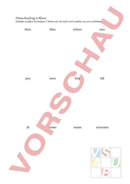 Deutschauftrag 4.Klasse Schreibe zu jedem Wortstamm 5 Wörter auf. Du darfst ä/ö/ü anstelle von a/o/u schreiben. blass fluss schluss nass pass mess kiss fall all komm nomm schwomm Verben: Ergänze die Tabelle: ich reisse ich riss ich habe gerissen ich beisse ich schloss ich habe gegossen ich fliesse ich weiss ich genoss ich habe geschossen Erfinde eine kurze Geschichte, in der all diese Begriffe vorkommen: vergessen, fressen, Suppe essen, messen, Kartoffeln Schreibe entweder in Vergangenheit oder Gegenwart. Du darfst auch andere Wörter brauchen.