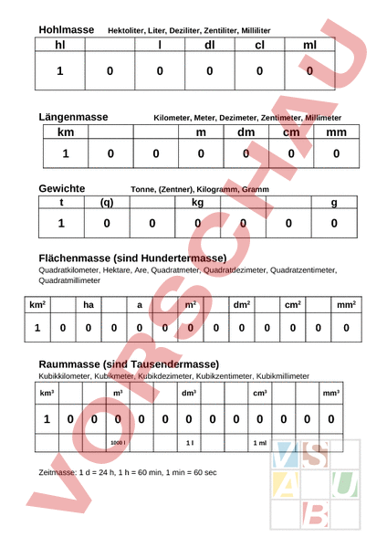 Hohlmasse Hektoliter, Liter, Deziliter, Zentiliter, Milliliter hl 1 0 Längenmasse dl cl ml 0 0 0 0 Kilometer, Meter, Dezimeter, Zentimeter, Millimeter km 1 0 Gewichte (q) 1 0 dm cm mm 0 0 0 0 0 Tonne, (Zentner), Kilogramm, Gramm kg 0 0 0 0 0 Flächenmasse (sind Hundertermasse) Quadratkilometer, Hektare, Are, Quadratmeter, Quadratdezimeter, Quadratzentimeter, Quadratmillimeter km2 1 ha 0 0 m2 0 0 0 0 dm2 0 cm2 0 0 mm2 0 0 0 Raummasse (sind Tausendermasse) Kubikkilometer, Kubikmeter, Kubikdezimeter, Kubikzentimeter, Kubikmillimeter km3 1 m3 0 0 0 1000 dm3 0 0 0 cm3 0 1l Zeitmasse: 1 24 h, 1 60 min, 1 min 60 sec 0 0 1 ml mm3 0 0 0