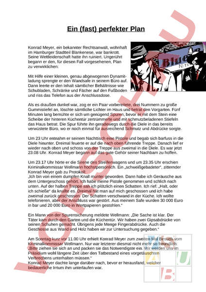 Ein (fast) perfekter Plan Konrad Meyer, ein bekannter Rechtsanwalt, wohnhaft im Hamburger Stadtteil Blankenese, war bankrott. Seine Wettleidenschaft hatte ihn ruiniert. Ungerührt begann er den, für diesen Fall vorgesehenen, Plan zu verwirklichen: Mit Hilfe einer kleinen, genau abgewogenen Dynamitladung sprengte er den Wandsafe in seinem Büro auf. Dann leerte er den Inhalt sämtlicher Behältnisse wie Schubladen, Schränke und Fächer auf den Fußboden und riss das Telefon aus der Anschlussdose. Als es draußen dunkel war, zog er ein Paar vorbereitete, drei Nummern zu große Gummistiefel an, löschte sämtliche Lichter im Haus und betrat den Vorgarten. Fünf Minuten lang bemühte er sich um genügend Spuren, bevor er mit dem Stein eine Scheibe der hinteren Küchentür zertrümmerte und mit schmutzbeladenen Stiefeln das Haus betrat. Die Spur führte ihn geradewegs durch die Diele in das bereits verwüstete Büro, wo er noch einmal für ausreichend Schmutz und Abdrücke sorgte. Um 23 Uhr entnahm er seinem Nachttisch eine Pistole und begab sich barfuss in die Diele hinunter. Dreimal feuerte er auf die nach oben führende Treppe. Danach lief er wieder nach oben und schoss von der Treppe aus zweimal in die Diele. Es war jetzt 23.08 Uhr. Konrad Meyer begann auf das gute Gehör seiner Nachbarn zu hoffen. Um 23.17 Uhr hörte er die Sirene des Streifenwagens und um 23.35 Uhr erschien Kriminalkommissar Wellmann höchstpersönlich. Ein „schweißgebadeter, zitternder Konrad Meyer gab zu Protokoll: „Ich bin von einem dumpfen Knall munter geworden. Dann habe ich Geräusche aus dem Untergeschoss gehört. Ich habe meine Pistole genommen und schlich nach unten. Auf der halben Treppe sah ich plötzlich einen Schatten. Ich rief: „Halt, oder ich schieße da knallte es. Dreimal hat man auf mich geschossen und ich habe zweimal zurück geschossen. Der Schatten verschwand in der Küche. Ich wollte telefonieren, aber der Anschluss war gestört. Aus meinem Safe wurden 30 000 Euro in bar und 20 000 Euro in Wertpapieren gestohlen. Ein Mann von der Spurensicherung meldete Wellmann: „Die Sache ist klar. Der Täter kam durch den Garten und die Küchentür. Wir haben zwei Gipsabdrücke von seinen Schuhen gemacht. Übrigens jede Menge Fingerabdrücke. Auch die Geschosse aus Wand und Holz haben wir zur Untersuchung gegeben. Am Sonntag kurz vor 11.00 Uhr erhielt Konrad Meyer zum zweiten Mal Besuch vom Kriminalkommissar Wellmann. Nur war letzterer diesmal nicht mehr so freundlich: „Bitte ziehen sie sich an und packen sie das Notwendigste ein. Wir werden uns im Präsidium wohl längere Zeit über den Tatbestand eines vorgetäuschten Verbrechens unterhalten müssen. Konrad Meyer dachte lange darüber nach, bevor er herausfand, welcher bedauerliche Irrtum ihm unterlaufen war. Arbeitsauftrag: 1. Stellt W- Fragen an den Text Wo? Wer? Wann? Was? Wie? Warum? 2. Lest nun den Text gründlich (jeder für sich): Markiert euch dabei wichtige Stellen 3. Beantwortet die Fragen aus Aufgabe 1 gemeinsam 4. Findet kurze Überschriften für die einzelnen Abschnitte (auf euer Textblatt) 5. Beantwortet die folgenden Fragen: Welchen Plan verfolgt Konrad Meyer? Welche Handlungen führt Konrad Meyer aus um seinen Plan zu verwirklichen? Listet in Stichworten auf! 6. Könnt ihr nun den Fall auflösen? Notiert in Stichworten: Welcher Fehler ist Konrad Meyer eurer Meinung nach bei der Durchführung seines Plans unterlaufen? Begründet eure Antwort und belegt dies mit entsprechenden Textstellen (Zeilenangaben genügen) Fach: Deutsch/ LKS Klasse: 7 Thema: Lösen eines Kriminalfalles mit Hilfe der 5-Gang Lesetechnik Verlaufsplan: Unterrichtsphasen/ Situations- und Handlungsfolge Zeitdauer Begrüßung Begrüßung der SuS und der anwesenden Gäste. 9.10 Uhr Motivation Die Lehrkraft zeigt den SuS Kommissar- Bild in Form von „Dalli- Klick. Musik begleitet diesen Vorgang. 9.11 Uhr Hinführung (LZ 1) 9.14 Uhr Erarbeitung 1 (LZ 2) 9.20 Uhr Erarbeitung 2 (LZ 2,4,5) 9.26 Uhr Ergebnissicherung (LZ 3) 9.43Uhr Kurze Reflexion (LZ 6) 9.50 Uhr Abschluss 9.53 Uhr Sozial-, Arbeits- o. Unterrichts- formen Medien frontal frontal OH- Projektor Folie CD- Player Die Assoziationen der SuS zum Einstiegsimpuls werden in Form eines Mind- Maps festgehalten. Die Lehrkraft verkündet das Thema der heutigen Stunde. Die Lehrkraft verteilt die Textblätter und erteilt den SuS den ersten Arbeitsauftrag: Text „überfliegen Vermutung zur Aufklärung des Falles auf eine Papierkarte schreiben und an die Rückseite der Tafel hängen. Die Lehrkraft erteilt den zweiten Arbeitsauftrag: Fragen an den Text stellen Text gründlich lesen Fragen beantworten Den Text in Textabschnitte gliedern, Überschriften finden Fragen auf dem Arbeitsblatt beantworten. Für schnelle SuS: Anschließender Dialog zwischen Kommissar und Konrad Meyer. Fragen werden besprochen Die SuS äußern sich darüber, um welchen Irrtum es sich gehandelt hat und begründen dies. (Bezug zu den Vermutungen zu Beginn wird hergestellt) Der Fall wird aufgelöst. Lehrkraft stellt einen Bezug zu der 5- Gang- Lesetechnik her: Was war heute wichtig, damit wir den Fall lösen konnten? Wie seid ihr vorgegangen? Plenum Tafel Bild frontal Textblätter Karten Patafix Die Lehrkraft erklärt den SuS die Hausaufgabe: Den Inhalt und die Aufklärung des Textes in Form eines Zeitungsberichts zusammenfassen. Die Lehrkraft schreibt die Hausaufgaben an die Tafel, die SuS notieren sie. Stuhlkreis Einzelarbeit Partnerarbeit Textblatt Arbeitsblatt Wörterbücher Stuhlkreis Textblatt Arbeitsblatt Stuhlkreis frontal