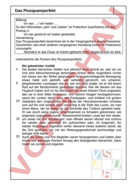 Das Plusquamperfekt Bildung: ich war wir hatten Zu den Hilfsverben „sein und „haben im Präteritum (war/hatten) tritt das Partizip 2: ich war gestürzt/ wir hatten gearbeitet Verwendung: Das Plusquamperfekt bezeichnet ein in der Vergangenheit abgeschlossenes Geschehen, das einer anderen vergangenen Handlung (meist im Präteritum) vorausgeht. Nachdem er das Feuer im Kamin gelöscht hatte, begab er sich ins Bett. Unterstreiche die Formen des Plusquamperfekts. Ein grässlicher Vorfall 1 Die beiden Menschen hielten nun plötzlich ihren Schritt an, weil sie vor sich eine Menschenmenge bemerkten. Schon einen Augenblick vorher war etwas aus der Reihe gesprungen, eine querschlagende Bewegung; etwas hatte sich gedreht, war seitwärts gerutscht, ein schwerer, 5 jähgebremster Lastwagen war es, wie sich jetzt zeigte, wo er mit einem Rad auf der Bordschwelle gestrandet dastand. Wie die Bienen um das Flugloch hatten sich im Nu Menschen um einen kleinen Fleck angesetzt, den sie in ihrer Mitte freiliessen. Von seinem Wagen herabgekommen, stand der Lenker darin, grau wie Packpapier, und erklärte mit groben 10 Gebärden den Unglücksfall. Die Blicke der Hinzukommenden richteten sich auf ihn und sanken dann vorsichtig in die Tiefe des Lochs, wo man einen Mann, der tot dalag, an die Schwelle des Trottoirs gebettet hatte. Er war durch seine eigene Unachtsamkeit zu Schaden gekommen, wie allgemein zugegeben wurde. Abwechselnd knieten Leute bei ihm nieder, 15 um etwas mit ihm anzufangen; man öffnete seinen Mantel und schloss ihn wieder, man versuchte ihn aufzurichten oder, im Gegenteil, ihn wieder hinzulegen; eigentlich wollte niemand etwas anderes damit, als die Zeit ausfüllen, bis mit der Rettungsgesellschaft sachkundige und befugte Hilfe käme. 20 Auch die Dame und ihre Begleiter waren herangetreten und hatten über Köpfe und gebeugte Rücken hinweg den Daliegenden betrachtet. Dann traten sie zurück und zögerten.