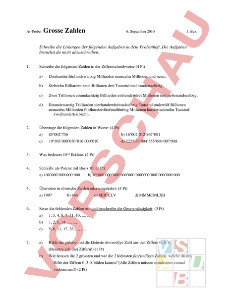 Ar-Probe: Grosse Zahlen 6. September 2010 1. Bez. Schreibe die Lösungen der folgenden Aufgaben in dein Probenheft. Die Aufgaben brauchst du nicht abzuschreiben. 1. 2. Schreibe die folgenden Zahlen in der Ziffernschreibweise (4 Pt) a) Dreihundertfünfundzwanzig Milliarden neunzehn Millionen und neun. b) Siebzehn Billiarden neun Billionen drei Tausend und hundertachtzig. c) Zwei Trillionen einundachtzig Billiarden einhundertdrei Millionen und siebenundsechzig. d) Einundzwanzig Trilliarden vierhundertdreiundsiebzig Tausend undzwölf Billionen neunzehn Milliarden fünfhundertfünfundfünfzig Millionen hundertachtzehn Tausend zweihundertsiebzehn. Übertrage die folgenden Zahlen in Worte: (4 Pt) a) 85002756 b) 16002012867‘001 c) 19‘505000030016000010 d) 222033004555066‘007‘888 3. Was bedeutet 104? Erkläre. (2 Pt) 4. Schreibe als Potenz mit Basis 10: (1 Pt) a) 100000000‘000‘000 5. Übersetze in römische Zahlen oder umgekehrt: (4 Pt) a) 1997 6. 7. b) 10000000000000000000000000000000‘000 b) 464 c) MDCCLV d) MMMCMLXII Setze die fehlenden Zahlen ein und beschreibe die Gesetzmässigkeit: (3 Pt) a) 1, 5, 4, 8, 7, 11, 10, ., . b) 1, 2, 5, 14, ., ., c) 5, 6, 11, 17, 28,, , a) Bilde die grösste und die kleinste dreistellige Zahl aus den Ziffern 0, 3, 8. (Benutze alle drei Ziffern!) (1 Pt) b) Wie heissen die 2 grössten und wie die 2 kleinsten fünfstelligen Zahlen, welche du mit Hilfe der Ziffern 0, 3, 8 bilden kannst? (Alle Ziffern müssen mindestens einmal vorkommen!) (2 Pt) c) Bilde die 2 grössten und die zwei kleinsten vierstelligen Zahlen aus allen Ziffern des Zehnersystems, wobei sich keine Ziffer wiederholen darf. (2 Pt) 8. a) Erinnere dich an die Geschichte mit dem Schachbrett: Wieviele Reiskörner wären auf dem 7. Feld? (1 Pt) b) Wie oft schreibst du die Zahl 0, wenn du von 1 bis 105 zählst? (1 Pt) c) Wieviele Möglichkeiten haben 4 Personen, sich in einer 3er-Gruppe zu verabreden? (1 Pt)