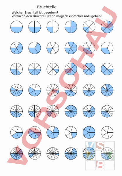 Es sind die im Kreisdiagramm dargestellten Brüche anzugeben (und wenn möglich zu vereinfachen z.B. 2/4 -> 1/2)