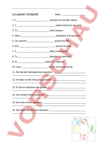 Le passé composé 1. Il Nom: (choisir) sa nouvelle voiture. 2. J 3. Tu (apprendre) tous les mots. (dire) bonjour. 4. Nous (répondre) à la question. 5. Les parents (punir) leur fille. 6. Elle (ouvrir) la porte. 7. Il (faire) ses devoirs. 8. Tu (planter) un pommier. 9. Ils (savoir) la réponse. 10. Vous (boire) une tasse de thé. 11. Sie hat den Springbrunnen gesehen. 12. Ich habe an der Kreuzung gewartet. 13. Er hat ein bisschen kalt gehabt. 14. Die Schüler haben gehorcht. 15. Wir sind in Paris gewesen. 16. Sie haben die Strasse überquert.