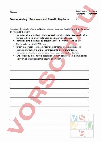 Name: Erreichbare Punktzahl Nacherzählung: Dann eben mit Gewalt, Kapitel 6 24 Erreichte Punktzahl Aufgabe: Bitte schreibe eine Nacherzählung über das Kapitel 6 und denke dabei an folgende Sachen: • Schreibe eine Einleitung: Welches Buch, welcher Autor das geschrieben hat und schreibe einen Satz über den Inhalt des Buches. • Schreibe eine Einleitung zu diesem Kapitel 6. Worum geht es da? Denke dabei an die 5 W-Fragen. • Erzähle, worüber in diesem Kapitel gesprochen wird und zeige die einzelnen Argumente und Gegenargumente der SchülerInnen. • Schreibe am Schluss, wie du persönlich über die Sache denkst. • Und – wenn du alles fertig geschrieben hast, schaue noch einmal deinen Text an, ob du alles richtig geschrieben hast.