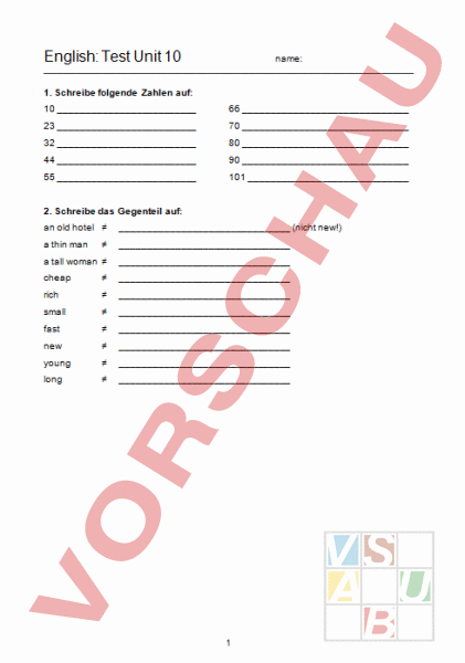 English: Test Unit 10 name: 1. Schreibe folgende Zahlen auf: 10 66 23 70 32 80 44 90 55 101 2. Schreibe das Gegenteil auf: an old hotel (nicht new!) thin man tall woman cheap rich small fast new young long 1 3. Wähle aus den aufgeführten Adjektiven zu den Autos zwei aus und schreibe dazu je eine Frage und eine Antwort nach dem gleichen Schema des Beispiels. Beispiel: Which dress is cheap? The English one. Adjektive: expensive, old, fast, slow, new American car Italian car 4. Frage nach den unterstrichenen Dingen und beginne jede Frage mit which: Peter and Ann like the French restaurant in Paris. She reads newspaper every Sunday. They want to have new house. He speaks more than one language. She sees one of her sons every Monday. He watches tennis match on Saturday. 2