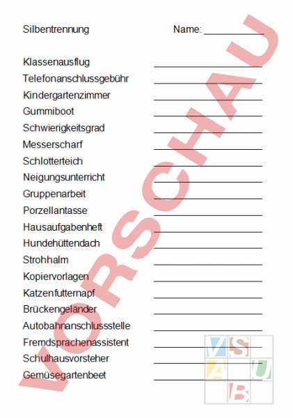 Silbentrennung Name: Klassenausflug  Telefonanschlussgebühr  Kindergartenzimmer  Gummiboot  Schwierigkeitsgrad  Messerscharf  Schlotterteich  Neigungsunterricht  Gruppenarbeit  Porzellantasse  Hausaufgabenheft  Hundehüttendach  Strohhalm  Kopiervorlagen  Katzenfutternapf  Brückengeländer  Autobahnanschlussstelle  Fremdsprachenassistent  Schulhausvorsteher  Gemüsegartenbeet