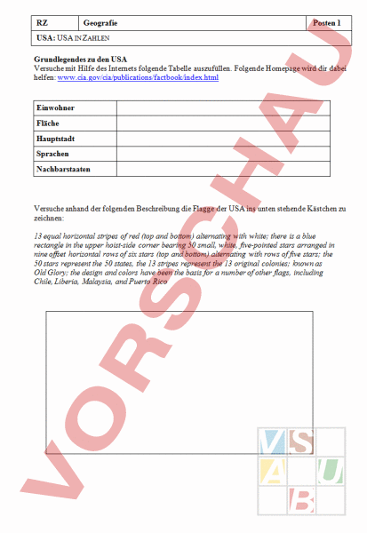 RZ Geografie Posten 1 USA: USA IN ZAHLEN Grundlegendes zu den USA Versuche mit Hilfe des Internets folgende Tabelle auszufüllen. Folgende Homepage wird dir dabei helfen: www.cia.gov/cia/publications/factbook/index.html Einwohner Fläche Hauptstadt Sprachen Nachbarstaaten Versuche anhand der folgenden Beschreibung die Flagge der USA ins unten stehende Kästchen zu zeichnen: 13 equal horizontal stripes of red (top and bottom) alternating with white; there is blue rectangle in the upper hoist-side corner bearing 50 small, white, five-pointed stars arranged in nine offset horizontal rows of six stars (top and bottom) alternating with rows of five stars; the 50 stars represent the 50 states, the 13 stripes represent the 13 original colonies; known as Old Glory; the design and colors have been the basis for number of other flags, including Chile, Liberia, Malaysia, and Puerto Rico