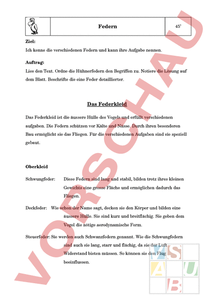 Federn 45 Ziel: Ich kenne die verschiedenen Federn und kann ihre Aufgabe nennen. Auftrag: Lies den Text. Ordne die Hühnerfedern den Begriffen zu. Notiere die Lösung auf dem Blatt. Beschrifte die eine Feder detaillierter. Das Federkleid Das Federkleid ist die äussere Hülle des Vogels und erfüllt verschiedenen aufgaben. Die Federn schützen vor Kälte und Nässe. Durch ihren besonderen Bau ermöglicht sie das Fliegen. Für die verschiedenen Aufgaben sind sie speziell gebaut. Oberkleid Schwungfeder: Diese Federn sind lang und stabil, bilden trotz ihres kleinen Gewichts eine grosse Fläche und ermöglichen dadurch das Fliegen. Deckfeder: Wie schon der Name sagt, decken sie den Körper und bilden eine äussere Hülle. Sie sind kurz und breitflächig. Sie geben dem Vogel die nötige aerodynamische Form. Steuerfeder: Sie werden auch Schwanzfedern genannt. Wie die Schwungfedern sind auch sie lang, starr und flächig, da sie der Luft Widerstand bieten müssen. So können sie den Flug beeinflussen. Unterkleid Daunen: Die Flaumenfedern (Daunen) bilden unter den Deckfedern eine Schicht. Die Daunen sind luftig und ballig wie Watte. So hat der Vogel zwischen Körper und Deckfedern eine Luftschicht. Das bewirkt eine gute Isolation. Aufbau der Feder Die Feder besteht aus einem langen und festen Federkiel sowie aus einer Federfahne. Die Federfahne besteht aus einer schmalen Aussenfahne und breiten Innenfahne. Der Kiel wird unterteil in den Federschaft und Federspule. Aus dem Federschaft gehen nach vorne und hinten Federäste aus. Aus diesen Federästen kommen die Bogenstrahlen und Hakenstrahlen hervor. An den Hakenstrahlen sitzen feine Häkchen welche sich mit den benachbarten Bogenstrahlen verhaken.
