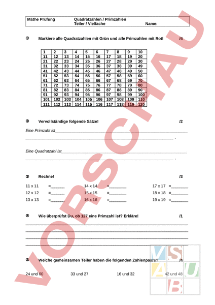 Mathe Prüfung Name: Markiere alle Quadratzahlen mit Grün und alle Primzahlen mit Rot! 1 11 21 31 41 51 61 71 81 91 101 111 Quadratzahlen Primzahlen Teiler Vielfache 2 12 22 32 42 52 62 72 82 92 102 112 3 13 23 33 43 53 63 73 83 93 103 113 4 14 24 34 44 54 64 74 84 94 104 114 5 15 25 35 45 55 65 75 85 95 105 115 6 16 26 36 46 56 66 76 86 96 106 116 7 17 27 37 47 57 67 77 87 97 107 117 8 18 28 38 48 58 68 78 88 98 108 118 9 19 29 39 49 59 69 79 89 99 109 119 /4 10 20 30 49 50 60 70 80 90 100 110 120 Vervollständige folgende Sätze! /2 Eine Primzahl ist Eine Quadratzahl ist Rechne! /3 11 11 14 14 17 17 12 12 15 15 18 18 13 13 16 16 19 19 Wie überprüfst Du, ob 127 eine Primzahl ist? Erkläre! /1 Welche gemeinsamen Teiler haben die folgenden Zahlenpaare? 24 und 60 33 und 27 16 und 32 /4 42 und 48 Welche gemeinsamen Vielfache haben die folgenden Zahlenpaare? (mind. 3 pro Aufgabe) /4 8 und 5 12 und 15 12 und 24 6 und 7 Ergänze! /6 Zahlenpaar ggT kgV 25 und 60 18 und 60 50 und 120 6 und 36 3 und 13 60 und 16 Notizen: Meine Bewertung: Unterschrift: Punkte: Note: /25