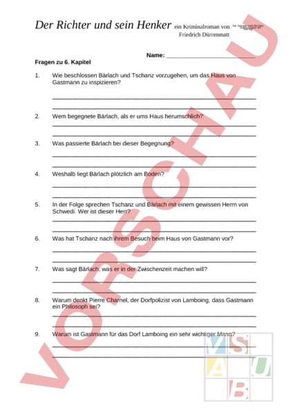 Der Richter und sein Henker ein Kriminalroman von Zur Anzeige wird der QuickTimeª Dekompressor ãÒ ben¶ tigt. Friedrich Dürrenmatt Name: Fragen zu 6. Kapitel 1. Wie beschlossen Bärlach und Tschanz vorzugehen, um das Haus von Gastmann zu inspizieren? 2. Wem begegnete Bärlach, als er ums Haus herumschlich? 3. Was passierte Bärlach bei dieser Begegnung? 4. Weshalb liegt Bärlach plötzlich am Boden? 5. In der Folge sprechen Tschanz und Bärlach mit einem gewissen Herrn von Schwedi. Wer ist dieser Herr? 6. Was hat Tschanz nach ihrem Besuch beim Haus von Gastmann vor? 7. Was sagt Bärlach, was er in der Zwischenzeit machen will? 8. Warum denkt Pierre Charnel, der Dorfpolizist von Lamboing, dass Gastmann ein Philosoph sei? 9. Warum ist Gastmann für das Dorf Lamboing ein sehr wichtiger Mann? Der Richter und sein Henker ein Kriminalroman von Zur Anzeige wird der QuickTimeª Dekompressor ãÒ ben¶ tigt. Friedrich Dürrenmatt Fragen zu 7. Kapitel 1. Als Tschanz mit seinem Auto auf dem Weg war, um Bärlach am vereinbarten Ort abzuholen, hielt er nochmals vor dem Haus von Gastmann. Welche Beobachtung konnte er da machen? 2. Was passierte, als Tschanz mit seinem Auto am Tatort vorbeifahren wollte? 3. Weshalb umklammerte Tschanz in seiner Manteltasche seinen Revolver, als er Bärlach in seinen Wagen einsteigen liess? 4. Über was sprechen die beiden auf ihrer Heimfahrt nach Bern? 5. Als Bärlach zu Hause ist, nimmt er etwas aus seiner Manteltasche und legt es auf seinen Schreibtisch neben sie Schlange. Was ist es? 6. Als Bärlach seinen Mantel auszieht, erfährt man etwas Besonderes über seinen linken Arm. Was? Total mögliche Punkte: Total gemachte Punkte: Note: