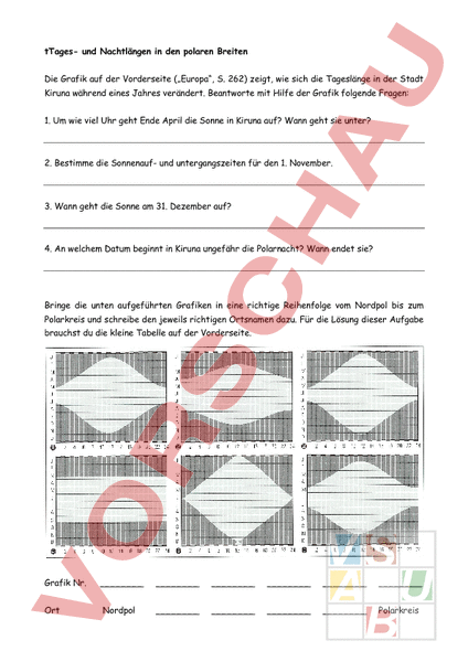 tTages- und Nachtlängen in den polaren Breiten Die Grafik auf der Vorderseite („Europa, S. 262) zeigt, wie sich die Tageslänge in der Stadt Kiruna während eines Jahres verändert. Beantworte mit Hilfe der Grafik folgende Fragen: 1. Um wie viel Uhr geht Ende April die Sonne in Kiruna auf? Wann geht sie unter? 2. Bestimme die Sonnenauf- und untergangszeiten für den 1. November. 3. Wann geht die Sonne am 31. Dezember auf? 4. An welchem Datum beginnt in Kiruna ungefähr die Polarnacht? Wann endet sie? Bringe die unten aufgeführten Grafiken in eine richtige Reihenfolge vom Nordpol bis zum Polarkreis und schreibe den jeweils richtigen Ortsnamen dazu. Für die Lösung dieser Aufgabe brauchst du die kleine Tabelle auf der Vorderseite. Grafik Nr. Ort Nordpol Polarkreis