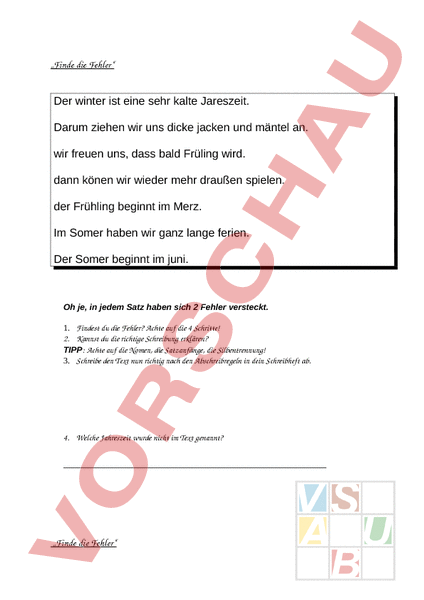 „Finde die Fehler Der winter ist eine sehr kalte Jareszeit. Darum ziehen wir uns dicke jacken und mäntel an. wir freuen uns, dass bald Früling wird. dann könen wir wieder mehr draußen spielen. der Frühling beginnt im Merz. Im Somer haben wir ganz lange ferien. Der Somer beginnt im juni. Oh je, in jedem Satz haben sich 2 Fehler versteckt. 1. Findest du die Fehler? Achte auf die 4 Schritte! 2. Kannst du die richtige Schreibung erklären? TIPP: Achte auf die Nomen, die Satzanfänge, die Silbentrennung! 3. Schreibe den Text nun richtig nach den Abschreibregeln in dein Schreibheft ab. 4. Welche Jahreszeit wurde nicht im Text genannt? „Finde die Fehler Der winter ist eine sehr kalte Jareszeit. Darum ziehen wir uns dicke jacken und mäntel an. wir freuen uns, dass bald Früling wird. dann könen wir wieder mehr draußen spielen. der Frühling beginnt im Merz. Im Somer haben wir ganz lange ferien. Der Somer beginnt im juni. Oh je, in jedem Satz haben sich 2 Fehler versteckt. 1. Findest du die Fehler? Achte auf die 4 Schritte! Du hast Glück, die falsch geschriebenen Wörter wurden schon unterstrichen. 2. Kannst du die richtige Schreibung erklären? TIPP: Achte auf die Nomen, die Satzanfänge, die Silbentrennung! 3. Schreibe den Text nun richtig nach den Abschreibregeln in dein Schreibheft ab. 5. Welche Jahreszeit wurde nicht im Text genannt?