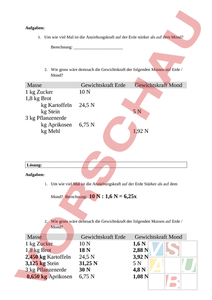 Aufgaben: 1. Um wie viel Mal ist die Anziehungskraft auf der Erde stärker als auf dem Mond? Berechnung: 2. Wie gross wäre demnach die Gewichtskraft der folgenden Massen auf Erde Mond? Masse 1 kg Zucker 1,8 kg Brot kg Kartoffeln kg Stein 3 kg Pflanzenerde kg Aprikosen kg Mehl Gewichtskraft Erde 10 Gewichtskraft Mond 24,5 5N 6,75 1,92 Lösung: Aufgaben: 1. Um wie viel Mal ist die Anziehungskraft auf der Erde Stärker als auf dem Mond? Berechnung: 10 : 1,6 6,25x 2. Wie gross wäre demnach die Gewichtskraft der folgenden Massen auf Erde Mond? Masse 1 kg Zucker 1,8 kg Brot 2,450 kg Kartoffeln 3,125 kg Stein 3 kg Pflanzenerde 0,650 kg Aprikosen Gewichtskraft Erde 10 18 24,5 31,25 30 6,75 Gewichtskraft Mond 1,6 2,88 3,92 5N 4,8 1,08 1,2 kg Mehl 12 11,92 Dichte: Jeder Körper hat nicht nur eine Masse, also ein bestimmtes Gewicht, sondern auch eine bestimmte Dichte: Zur Veranschaulichung der Dichte eines Stoffes folgende Abbildung Der dünne Max in Gelb hebt seine Kugel locker mit einer Hand, während Peterli seine doch gleichgrosse Kugel kaum anheben kann. Wie kann das sein? Ganz einfach; die Materialien haben eine unterschiedliche Dichte (Festigkeit des Materials) und sind somit unterschiedlich schwer. Die Dichte von jedem Material ist mit einer Formel bestimmbar: Dichte Masse g) Volumen cm3) oder ƿ mV Oder in Worten: Um die Dichte eines Stoffes zu erfahren, muss die Masse des Körpers durch das Volumen des Körpers geteilt werden. Beispiel: Berechnung der Dichte eines Ziegelsteins Vorgehen: 1. Wiegen der Masse in 2. Berechnen des Volumens in cm3 3. Masse durch Volumen teilen 23 cm · 11 cm · 6 cm 1518 cm3 2884 Dichte ƿ 2884 g1518 cm3 1,9 gcm3 Wozu das Ganze??? Mithilfe dieser Ergebnisse kann ich Stoffe in der Physik miteinander vergleichen. Wasser ist dabei der Vergleichsstoff mit einer Dichte von 1 pro cm3. Jeder Stoff besitzt eine ganz bestimmte Dichte: Frage: Was passiert, wenn ich folgende Stoffe in ein Gefäss mit Wasser werfe? Kupferblech: Holz: Glas: Salatöl: Begründung: Aufgabe 1: Zeige, dass du verstanden hast. Berechne dazu wie im Beispiel gezeigt, schrittweise die Dichte eines Eisenblockes mit einer Masse von 45504 g: 12cm 15cm Aufgabe 2: 32cm Errechne die Dichte eines Steines, der eine Masse von 0,09 kg und ein Volumen von 0,045 dm3 hat. Was musst du zuerst beachten? Berechnung: Aus welchem Material besteht dieser Stein? Aufgabe 3: Du weisst die Dichte eines bestimmten Materials, nämlich 11,3 gcm3 Berechne die Masse des bestimmten Körpers in kg, wenn das Volumen 1267cm3 beträgt. Wie würde die Formel lauten, wenn du die Masse berechnen müsstest? Die Dichte von Flüssigkeit: Das Volumen von Flüssigkeit kannst du mit einem Messzylinder bestimmen. Denn man weiss, 1 Liter entspricht immer 1 dm3 Volumen. Aufgabe 4: Überprüfe die Dichte von Wasser, wenn 5 dl 500 wiegt: 5 dl cm3 Formel der Dichte: Berechnung: Was, wenn das Volumen nicht so einfach berechnet werden kann, da der Gegenstand zum Beispiel unförmig ist? Das Volumen eines Kieselsteins kannst du mit einem Messzylinder bestimmen (siehe Abb.4). Dazu musst du so viel Wasser einfüllen, dass der Stein vollständig untertauchen kann. Dann liest du das Wasservolumen genau ab. Danach tauchst du den Stein sorgfältig ins Wasser und liest den neuen Wasserstand ab. Du erhältst das Volumen des Steins, wenn du die Differenz aus der zweiten und der ersten Messung bildest. (Differenzmethode) Du musst natürlich die ml in cm3 umwandeln: 1ml 1cm3! Die Masse kann mit einer Waage festgestellt werden. Aufgabe 5: Bestimme die Dichten der vorgegebenen Gegenstände. Aufgabe 6: Versuche die Überlaufmethode aus der Abbildung 4 (B) zu erklären.