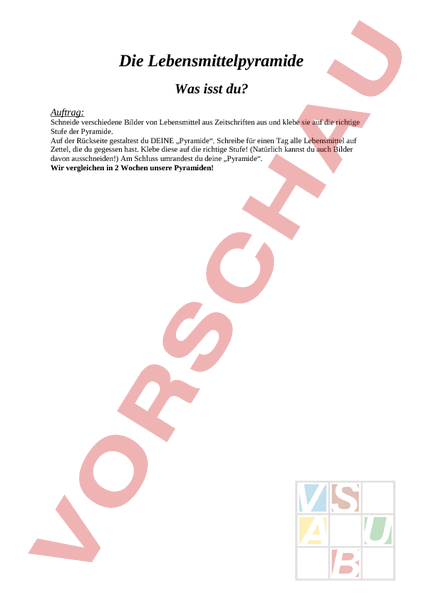 Die Lebensmittelpyramide Was isst du? Auftrag: Schneide verschiedene Bilder von Lebensmittel aus Zeitschriften aus und klebe sie auf die richtige Stufe der Pyramide. Auf der Rückseite gestaltest du DEINE „Pyramide. Schreibe für einen Tag alle Lebensmittel auf Zettel, die du gegessen hast. Klebe diese auf die richtige Stufe! (Natürlich kannst du auch Bilder davon ausschneiden!) Am Schluss umrandest du deine „Pyramide. Wir vergleichen in 2 Wochen unsere Pyramiden! Meine Pyramide Name: Datum: Süssigkeiten, salzige Knabbereien, gesüsste Getränke Öle, Fette, Nüsse Milch und Milchprodukte Fleisch, Fisch, Eier, Tofu Getreideprodukte, Kartoffeln und Hülsenfrüchte Gemüse und Früchte, Fruchtsäfte Getränke ungezuckert oder nur wenig