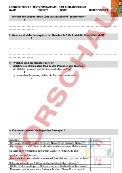 LERNKONTROLLE TEXTVERSTÄNDNIS DAS AUSTAUSCHKIND NAME: PUNKTE: NOTE: UNTERSCHRIFT: 1. Wer hat den Jugendroman „Das Austauschkind geschrieben? 1 2. Welches sind die Schauplätze der Geschichte? Wo findet die Geschichte statt? 2 3. Welches sind die Hauptpersonen? Zeichne ein kleines MindMap zu den Personen des Buches. a) Welche Personen sind für die Geschichte wichtig? 4 b) In welcher Beziehung stehen die Personen zueinander. 4 4. Von wem stammen die folgenden Aussagen? 9 Aussage: „Nonono, Jasper! „Das sind nur die Nerven! Die dummen Nerven! „Wie ich euch hasse! Könnt ihr denn keinen Menschen in Ruhe lassen? So lasst doch wenigstens den armen Jasper in Frieden. Ihr seid quadratkarierte Spiesser „Wenn die Pickpeers wieder anrufen, erkläre ich ihnen, dass es mit ihrem Sohn einfach nicht geht. Dass wir ihn zurückschicken müssen. „Wickle dir deinen Jasper in Seidenpapier und bind ein Mascherl drum! „Man muss jetzt eben andere Saiten aufziehen. Dieser Knabe braucht Person: eine starke Hand, eine streng leitende. „I feel sick! „Lass meine Filtertüten! Das ist Blumendünger! „Jetzt wart ich, bis sie ins Auto gestiegen und weggefahren sind, dann geh ich mit Jasper in den Prater. „Und überhaupt und sowieso! Mir reicht es Lehrer und Schulkollegen 6x die Woche zu sehen. Freiwillig mach ich da nicht mit! 5. Fragen zum Text: Teilweise sind auch mehrere Antworten möglich! a) Woher kommt der Spitzname „Elsi für Ewald? 1 Von der Abkürzung von Ewalds Geburtstag am 11. Juli, nämlich Von dem Namen eines Jungen aus einer Fernsehserie Von den Anfangsbuchstaben seiner vier Vornamen El(fter) si(ebter) b) Welche Vorbereitungen für Tom hat die Mutter getroffen? (Mehrere Lösungen richtig) 1 Sie hat Kaffeehäferl mit der Aufschrift „Tom gekauft. Sie hat alle Kisten aus Ewalds Zimmer weggeworfen. Sie hat Ewalds Zimmer komplett umgeräumt. c) Warum wurde die Grossmutter krank? 1 Weil sie fünf Gänseschmalzbrote gegessen hatte Weil sie verschimmelten Käse gegessen hatte Weil sie angefaultes Obst gegessen hatte. d) Was meint Ewald, wenn er sagt: „Natürlich waren wir wieder einmal nach vorne unpünktlich. 2 e) Warum ist Peter am Flughafen so entsetzt? 1 f) Was hat Jasper in seinem schwersten Gepäckstück? 1 g) Warum will Jasper ein Zimmer für sich allein? 1 h) Wie finanzieren Bille und Ewald die heimlichen Besuche auf dem Prater? 1 mit dem Zeugnisgeld mit Geldgeschenken von Oma und Grossmutter mit dem Taschengeld i) Warum war Jasper schon in vier verschiedenen Internaten (Privatschulen) gewesen? 2 j) Was erfährt man über Jaspers Familiensituation? Was weisst du über die Mutter, den Vater, Mary, Mr. Pickpeer? 3 k) Warum wollen die Eltern Jasper plötzlich doch nicht mehr nach Hause schicken? 2 l) Wie verbringt die Familie die Ferien? 2 in einer Ferienwohnung an einem See im Hotel am Meer Sie zelten. in einer Grossstadt m) Was passiert, als Bille, Ewald und Jasper im Hotel auf Mama und Papa warten? 1 n) In diesem Moment muss die Familie zusammenhalten. Was unternimmt sie? 2 o) Die Ferienreise endet ziemlich plötzlich. Beschreibe die Vorkommnisse, die zum Ferienabbruch führten möglichst genau. 4 p) Zurück in Wien kommt es zu einer grossen Aufregung. Was ist passiert? 2 q) Was schenkt Jasper seiner Gastfamilie zum Abschied? 1