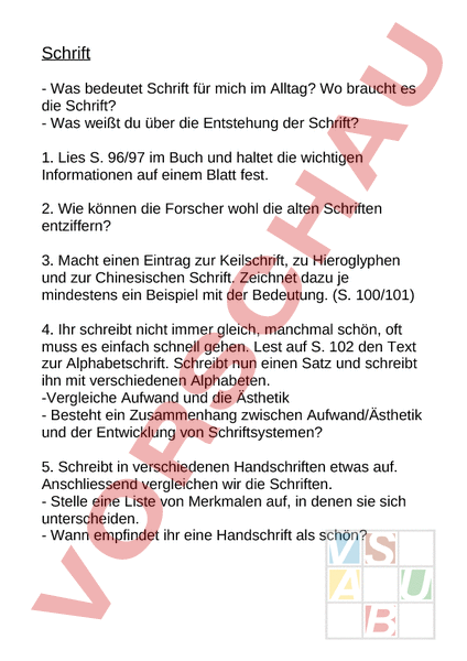Schrift Was bedeutet Schrift für mich im Alltag? Wo braucht es die Schrift? Was weißt du über die Entstehung der Schrift? 1. Lies S. 96/97 im Buch und haltet die wichtigen Informationen auf einem Blatt fest. 2. Wie können die Forscher wohl die alten Schriften entziffern? 3. Macht einen Eintrag zur Keilschrift, zu Hieroglyphen und zur Chinesischen Schrift. Zeichnet dazu je mindestens ein Beispiel mit der Bedeutung. (S. 100/101) 4. Ihr schreibt nicht immer gleich, manchmal schön, oft muss es einfach schnell gehen. Lest auf S. 102 den Text zur Alphabetschrift. Schreibt nun einen Satz und schreibt ihn mit verschiedenen Alphabeten. -Vergleiche Aufwand und die Ästhetik Besteht ein Zusammenhang zwischen Aufwand/Ästhetik und der Entwicklung von Schriftsystemen? 5. Schreibt in verschiedenen Handschriften etwas auf. Anschliessend vergleichen wir die Schriften. Stelle eine Liste von Merkmalen auf, in denen sie sich unterscheiden. Wann empfindet ihr eine Handschrift als schön? Schrift 1. Weshalb war und ist Schrift wichtig? Welchen Gründen dient die Schrift? 2. Erkläre kurz wie die Schrift entstanden ist bis zur Alphabetschrift. 3. Was weißt du über die Keilschrift? 4. Warum waren die Schriften früher viel gemalter, verschnörkelter und mit mehr Aufwand geschrieben? Warum ist das heute nicht mehr so? 5. Warum gibt es verschiedene Morseschriften?