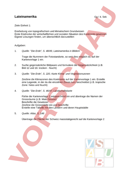 Lateinamerika Gg 4. Sek Ziele Einheit 1: Erarbeitung von topografischem und klimatischem Grundwissen Erste Eindrücke der wirtschaftlichen und sozialen Situation des Kontinents gewinnen Eigene Lösungen finden, um übersichtlich darzustellen Aufgaben: 1. Quelle: Die Erde, S. 48/49, Lateinamerika in Bildern Trage die Nummern der Fotostandorte, so weit dies möglich ist, auf der Kartenvorlage 1 ein. 2. Suche gegensätzliche Bildpaare und formuliere die Gegensätzlichkeit (z.B. Bild 12 und 16: trocken feucht) 3. Quelle: Die Erde, S. 220, Karte Klima- und Vegetationszonen Zeichne die Klimazonen des Kontinents auf der Kartenvorlage 1 ein. Erstelle eine Legende, in der du die einzelnen Zonen kurz beschreibst (z.B. tropische Zone: heiss und feucht) 4. Quelle: Die Erde, S. 46/47, Landschaftskarte Färbe die Kartenvorlage 2 entsprechend ein und übertrage die Namen der Grossräume (z.B. Mato Grosso) Beschrifte die Gewässer Zeichne die Grossstädte ein und beschrifte Erstelle eine Tabelle mit den Ländern und deren Hauptstädte 5. Quelle: Atlas, S. 146 Übertrage die Fläche der Schweiz massstabgerecht auf die Kartenvorlage 2