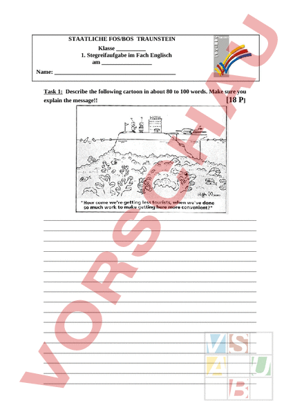 STAATLICHE FOS/BOS TRAUNSTEIN Klasse 1. Stegreifaufgabe im Fach Englisch am Name: Task 1: Describe the following cartoon in about 80 to 100 words. Make sure you explain the message!! [18 P] Task 2: Explain the meaning of the following words in complete English sentences. [9 P] 1. invigorated 2. conservation 3. architectural treasures Total [of 27] is