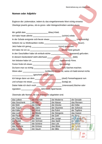 Nominalisierung von Adjektiven Nomen oder Adjektiv Ergänze die Lückensätze, indem du das eingeklammerte Wort richtig einsetzt. Überlege jeweils genau, ob es gross- oder kleingeschrieben werden muss. Mir gefällt dein (blau) Kleid. Ich habe heute allerlei (schön) erlebt. In der Schule ereignete sich heute etwas (merkwürdig). Schenk mir zu Weihnachten nichts (teuer). Jetzt habe ich genug (süss) gegessen. Ich habe mir ein zu (klein) Kleid gekauft. In den Geschäften habe ich einfach nichts (passend) gefunden. In diesem Dankesbrief steht allerhand (lieb). Am liebsten habe ich (spannend) Filme. Ferien finde ich etwas (grossartig). Da kann man so richtig (toll) Sachen machen. Wenn aber (schlecht) Wetter ist, weiss ich bald einmal nichts (gescheit) anzufangen. Ich hänge dann vor dem (doof) Fernsehapparat rum und schaue mir etwas (lustig) an. Dabei hätte ich doch noch (interessant) Bücher oder irgendein (lehrreich) Spiel bereit. Übermale alle Nomen, de von Adjektiven abgeleitet sind. das Leben das Geschenk die Welt der Traum die Kälte das Loch der Faule die Pflanze die Nadel der Turm das Dumme das Ganze der Fremde die Alte die Weite der Zahn der Wind der Blinde die Stile der Strom der Schnee die Schöne die Grösse der Saum die Moderne die Nässe die Glocke der Stumme die Fahrt die Sängerin die Zahl der Junge das Spiel das Lob das Böse der Blitz die Gerade das Rennen die Höhe der Schreck der Tapfere das Ganze der Berg der Einsame die Wellen die Kleine der Schritt der Kreis