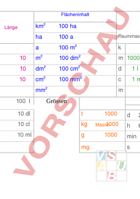 Flächeninhalt Länge km Volumen km2 100 ha ha 100 Raummasse 100 m2 1000 10 m2 100 dm2 1000 dm 10 dm2 100 cm2 3 1l cm 10 cm2 100 mm2 cm 1 ml mm2 mm hl 100 Hohlmasse m Grössen Zeit Winkel nicht dezimal 10 dl dl 10 cl kg cl 10 ml ml mg mg 1000 24 (Grad) 1000 Masse 60 min (min) 1000 min 60 (sec) 60 60