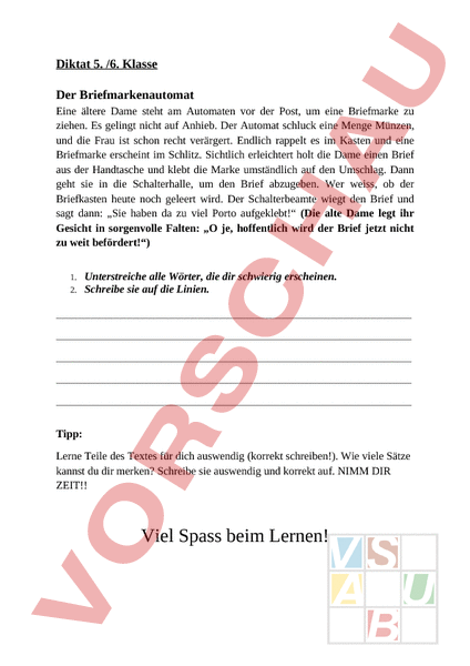 Diktat 5. /6. Klasse Der Briefmarkenautomat Eine ältere Dame steht am Automaten vor der Post, um eine Briefmarke zu ziehen. Es gelingt nicht auf Anhieb. Der Automat schluck eine Menge Münzen, und die Frau ist schon recht verärgert. Endlich rappelt es im Kasten und eine Briefmarke erscheint im Schlitz. Sichtlich erleichtert holt die Dame einen Brief aus der Handtasche und klebt die Marke umständlich auf den Umschlag. Dann geht sie in die Schalterhalle, um den Brief abzugeben. Wer weiss, ob der Briefkasten heute noch geleert wird. Der Schalterbeamte wiegt den Brief und sagt dann: „Sie haben da zu viel Porto aufgeklebt! (Die alte Dame legt ihr Gesicht in sorgenvolle Falten: „O je, hoffentlich wird der Brief jetzt nicht zu weit befördert!) 1. 2. Unterstreiche alle Wörter, die dir schwierig erscheinen. Schreibe sie auf die Linien. Tipp: Lerne Teile des Textes für dich auswendig (korrekt schreiben!). Wie viele Sätze kannst du dir merken? Schreibe sie auswendig und korrekt auf. NIMM DIR ZEIT!! Viel Spass beim Lernen!