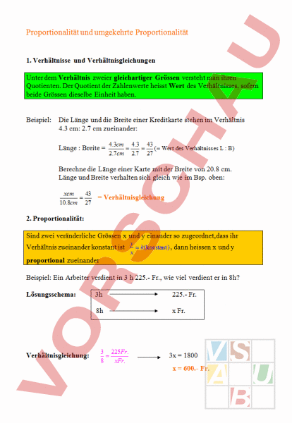 Proportionalität und umgekehrte Proportionalität 1. Verhältnisse und Verhältnisgleichungen Unter dem Verhältnis zweier gleichartiger Grössen versteht man ihren Quotienten. Der Quotient der Zahlenwerte heisst Wert des Verhältnisses, sofern beide Grössen dieselbe Einheit haben. Beispiel: Die Länge und die Breite einer Kreditkarte stehen im Verhältnis 4.3 cm: 2.7 cm zueinander: Länge Breite 4.3cm 4.3 43 ( Wert des Verhältnisses : B) 2.7cm 2.7 27 Berechne die Länge einer Karte mit der Breite von 20.8 cm. Länge und Breite verhalten sich gleich wie im Bsp. oben: xcm 43 10.8cm 27 Verhältnisgleichung 2. Proportionalität: Sind zwei veränderliche Grössen und einander so zugeordnet,dass ihr Verhältnis zueinander konstant ist (konstant) dann heissen und x proportional zueinander Beispiel: Ein Arbeiter verdient in 3 225.- Fr., wie viel verdient er in 8h? Lösungsschema: Verhältnisgleichung: 3h 225.- Fr. 8h Fr. 3 225 Fr. 8 xFr. 3x 1800 600.- Fr. 3. Umgekehrte Proportionalität Sind zwei veränderliche Grössen und einander so zugeordnet, dass sie sich umgekehrt proportional zueinander verhalten, dann bildet sich die Konstante aus dem Produkt der beiden Werte: • Beispiel: 12 Maschinen brauchen 4 für eine Arbeit. Wie lange brauchen 16 M.? Lösungsschema: Verhältnisgleichung. umgekehrt! 12 M. 4h 16 xh 12 xh 16 4h 48 16 x 3h