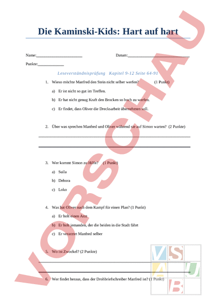 Die Kaminski-Kids: Hart auf hart Name:_ Datum:_ Punkte:_ Leseverständnisprüfung Kapitel 9-12 Seite 64-91 1. Wieso möchte Manfred den Stein nicht selber werfen? (1 Punkt) a) Er ist nicht so gut im Treffen. b) Er hat nicht genug Kraft den Brocken so hoch zu werfen. c) Er findet, dass Oliver die Drecksarbeit übernehmen soll. 2. Über was sprechen Manfred und Oliver während sie auf Simon warten? (2 Punkte) 3. Wer kommt Simon zu Hilfe? (1 Punkt) a) Suila b) Debora c) Loko 4. Was hat Oliver nach dem Kampf für einen Plan? (1 Punkt) a) Er holt einen Arzt b) Er holt jemanden, der die beiden in die Stadt fährt c) Er verarztet Manfred selber 5. Wo ist Zwockel? (2 Punkte) 6. Wer findet heraus, dass der Drohbriefschreiber Manfred ist? (1 Punkt) 7. Wie findet er/sie heraus, dass es Manfred ist? (1 Punkt) 8. Wo versteckt sich Manfred? (1 Punkt) 9. Was für eine Abmachung hat Manfred mit den Kaminski-kids getroffen? (2 Punkte)