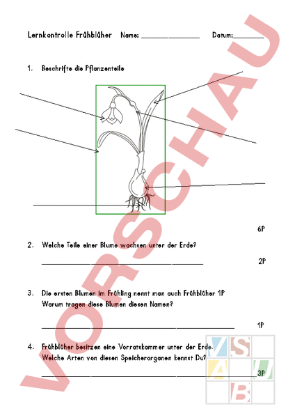 Lernkontrolle Frühblüher 1. Name: Datum:_ Beschrifte die Pflanzenteile 6P 2. Welche Teile einer Blume wachsen unter der Erde? 3. 2P Die ersten Blumen im Frühling nennt man auch Frühblüher 1P Warum tragen diese Blumen diesen Namen? 4. 1P Frühblüher besitzen eine Vorratskammer unter der Erde. Welche Arten von diesen Speicherorganen kennst Du? 3P 5. Was haben die Blumen in ihrer Vorratskammer gesammelt?1P 6. Wo wachsen die Frühblüher meistens?1P 7. Welche Blume hat die Blütenfarbe weiss? a) Buschwindröschen b) Veilchen c) Huflattich 8. 1P Welche Blume erinnert an ein Organ im Körper? a) Tulpe b) Krokus c) Lungenkraut 9. 1P Welche Frühblüher kennst Du? 5P Deine Einschätzung: Erreichte Punktzahl: