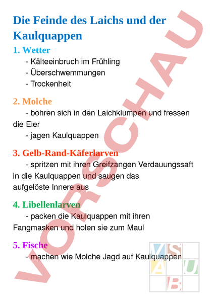 Feinde des Laichs und der Kaulquappen und des Frosches als Hefteintragsvorlage