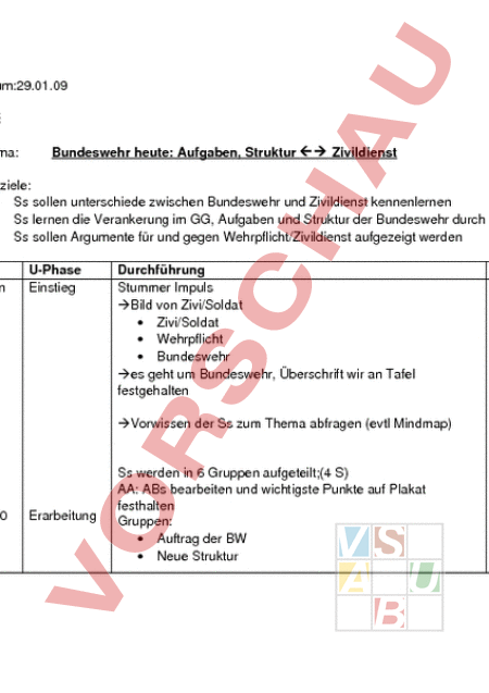 Datum:29.01.09 Klasse 9a Fach GSE Thema: Bundeswehr heute: Aufgaben, Struktur Zivildienst Lernziele: • Ss sollen unterschiede zwischen Bundeswehr und Zivildienst kennenlernen • Ss lernen die Verankerung im GG, Aufgaben und Struktur der Bundeswehr durch Gruppenarbeit kennen • Ss sollen Argumente für und gegen Wehrpflicht/Zivildienst aufgezeigt werden Zeit 5 Min UPhase Einstieg Durchführung Stummer Impuls Bild von Zivi/Soldat • Zivi/Soldat • Wehrpflicht • Bundeswehr es geht um Bundeswehr, Überschrift wir an Tafel festgehalten Sozialform SsÄußerungen Medien OHP schreibt Überschrift an Tafel Tafel LSG Vorwissen der Ss zum Thema abfragen (evtl Mindmap) 6070 Min Erarbeitung Ss werden in 6 Gruppen aufgeteilt;(4 S) AA: ABs bearbeiten und wichtigste Punkte auf Plakat festhalten Gruppen: • Auftrag der BW • Neue Struktur teilt in Gruppen ein, teilt ABs, Plakate, Stifte aus und gibt AA, Ss sprechen sich leise ab und führen AA aus AB/Plakat • • • • 1015 Min Sicherung Pro/Contra Wehrpflicht Frauen bei der BW Verankerung im GG Verweigerung Plakate werden aufgehängt, Gruppen werden so gemischt, dass immer ein aus jeder Gruppe dabei ist (4 Gruppen 6 Ss) Expertenrunde Experten erklären anderen aus der Gruppe ihr Plakat (5 Min Routation) Ss bekommen vorgefertigten HE zum Einkleben, dieser wird gemeinsam gelesen und nicht Verstandenes wird geklärt L Beobachter Plakate teilt HE aus; LSG AB